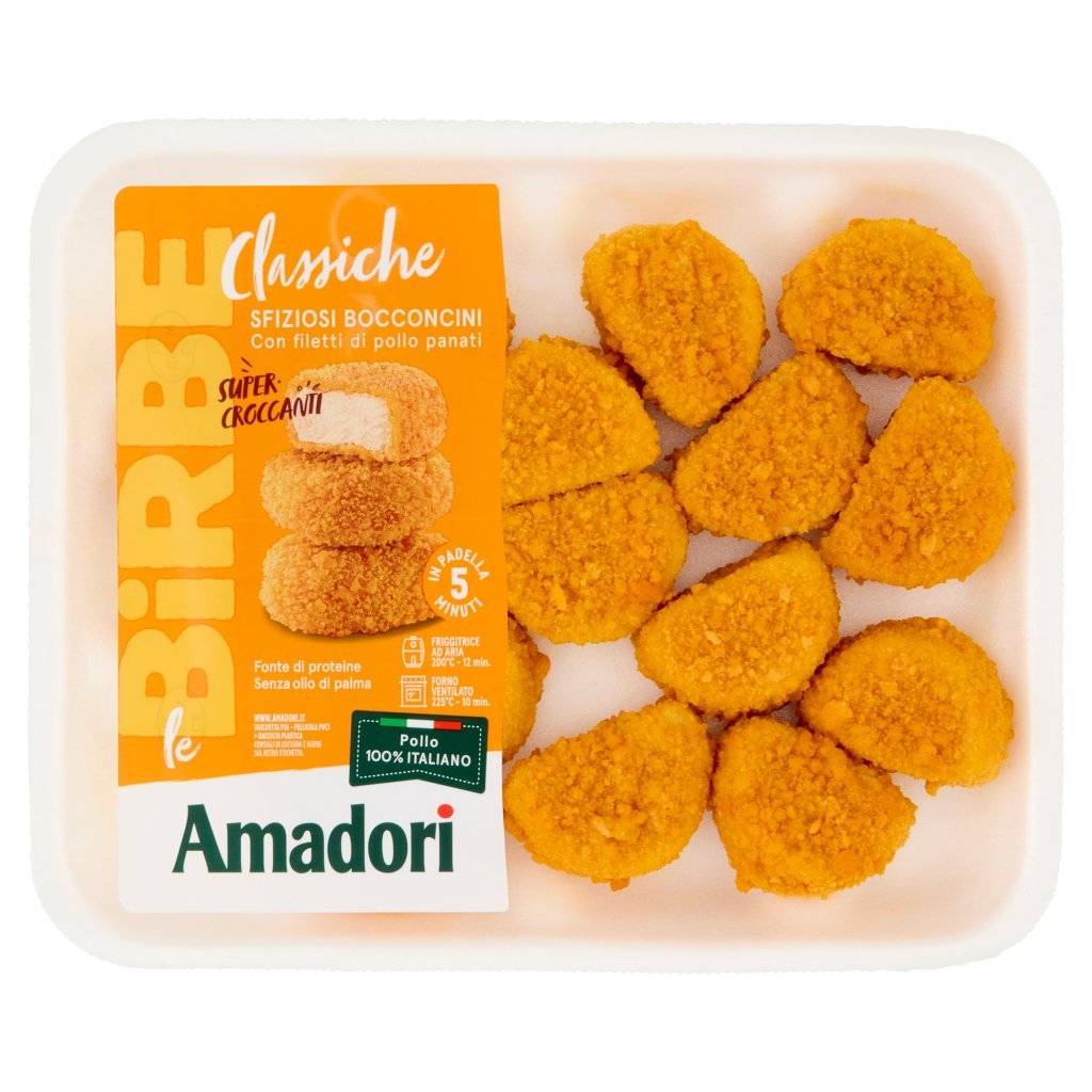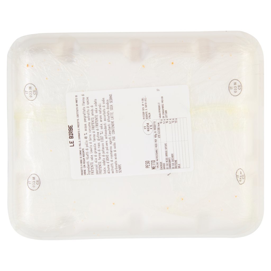 Filetti di pollo 48%, Acqua, Pangrattato (farina di frumento, sale, lievito di birra, curcuma, estratto di spezie: paprica), Olio di girasole, Farina di frumento, Amido di frumento, Farina di mais, Glutine di frumento, Sale iodato (sale, iodato di potassio 0,007 %), Sale, Aromi naturali, Albume d'uovo in polvere, Antiossidanti: ascorbato di sodio, estratti di rosmarino, Agenti lievitanti: difosfato disodico, carbonato acido di sodio, Puo' contenere latte, soia, sedano, senape