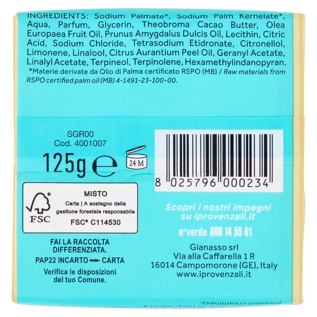Sodium Palmate*, Sodium Palm Kernelate*, Aqua, Parfum, Glycerin, Theobroma Cacao Butter, Olea Europaea Fruit Oil, Prunus Amygdalus Dulcis Oil, Lecithin, Citric Acid, Sodium Chloride, Tetrasodium Etidronate, Citronellol, Limonene, Linalool, Citrus Aurantium Peel Oil, Geranyl Acetate, Linalyl Acetate, Terpineol, Terpinolene, Hexamethylindanopyran, *Materie derivate da Olio di Palma certificato RSPO (MB) 4-1491-23-100-00