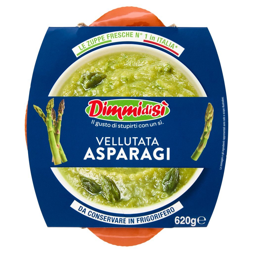 Acqua, Patate, Asparagi 21%, Bevanda di soia (acqua, semi di soia no OGM, sale), Olio di oliva, Porri, Sale, Aroma, Può contenere tracce di cereali contenenti glutine, frutta a guscio, latte, sedano e uova