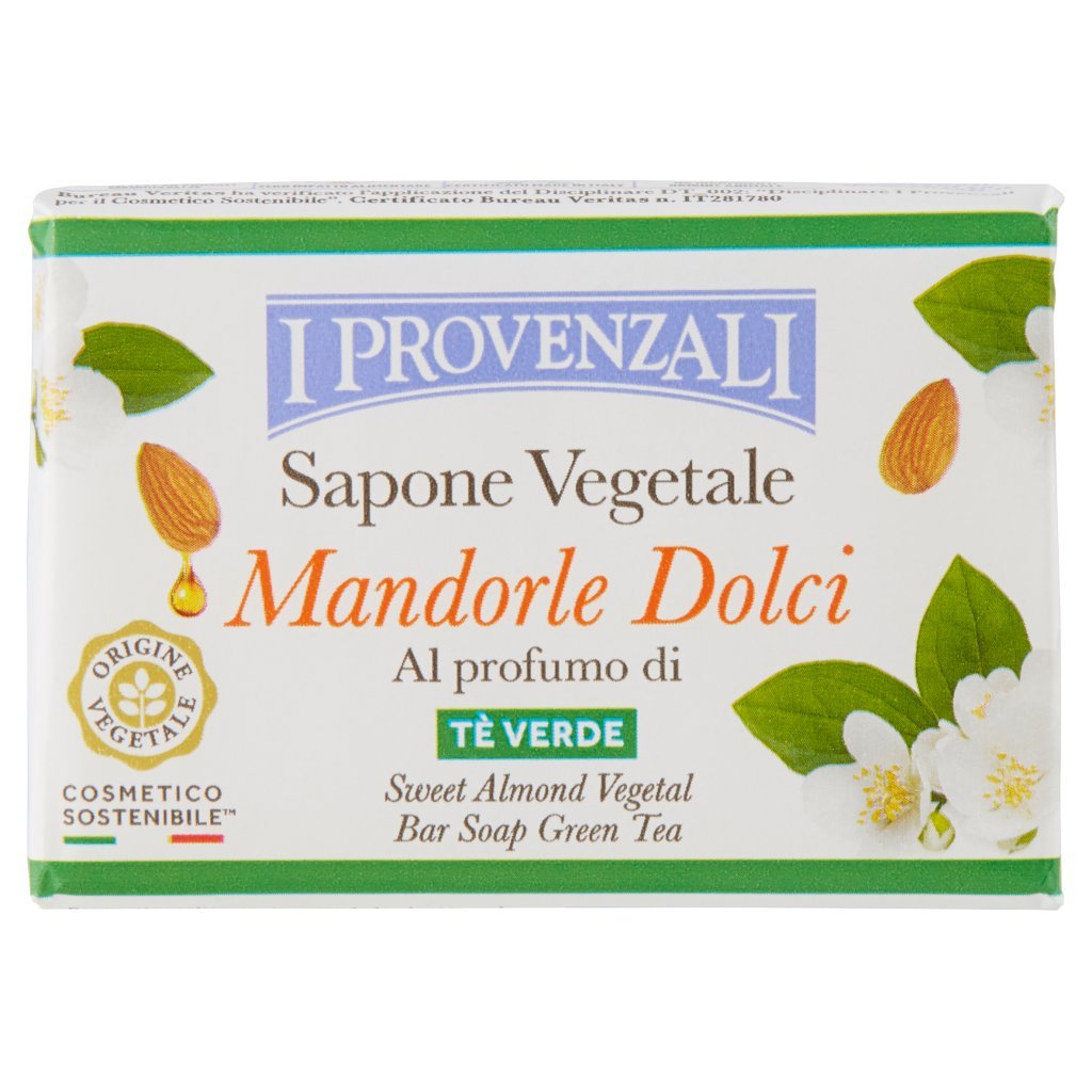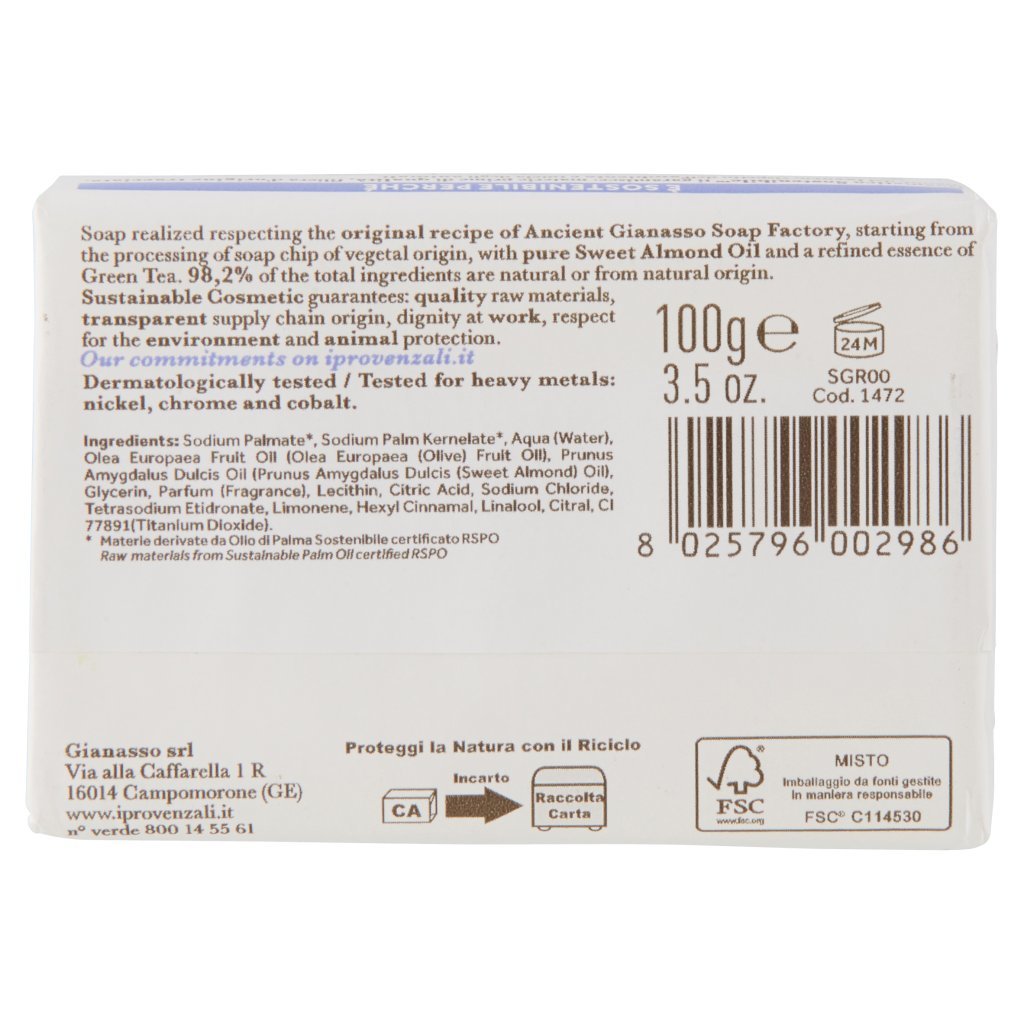 Sodium Palmate*, Sodium Palm Kernelate*, Aqua (Water), Olea Europaea Fruit Oil (Olea Europaea (Olive) Fruit Oil), Prunus Amygdalus Dulcis Oil (Prunus Amygdalus Dulcis (Sweet Almond) Oil), Glycerin, Parfum (Fragrance), Lecithin, Citric Acid, Sodium Chloride, Tetrasodium Etidronate, Limonene, Hexyl Cinnamal, Linalool, Citral, CI 77891 (Titanium Dioxide), *Materie derivate da Olio di Palma Sostenibile certificato RSPO