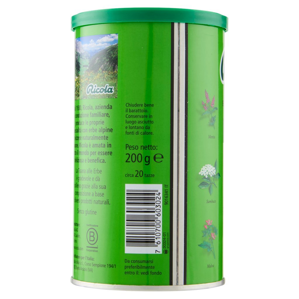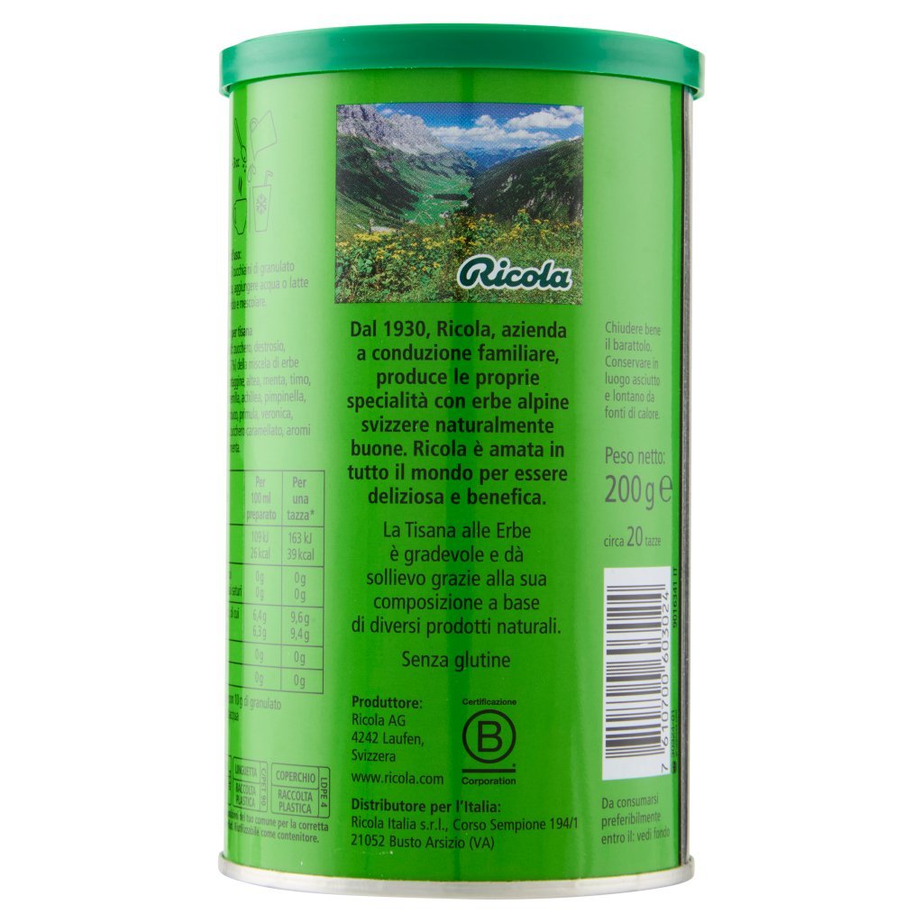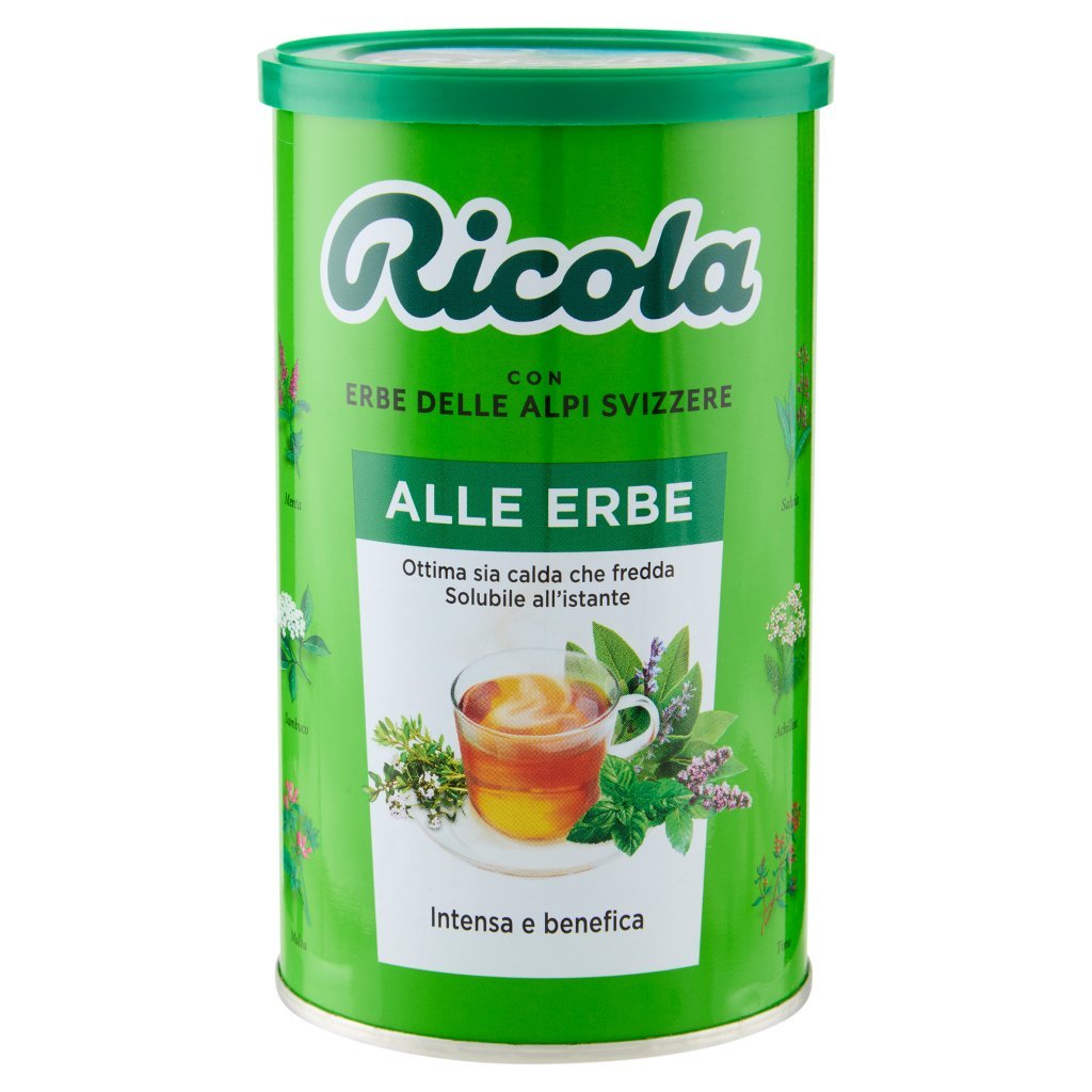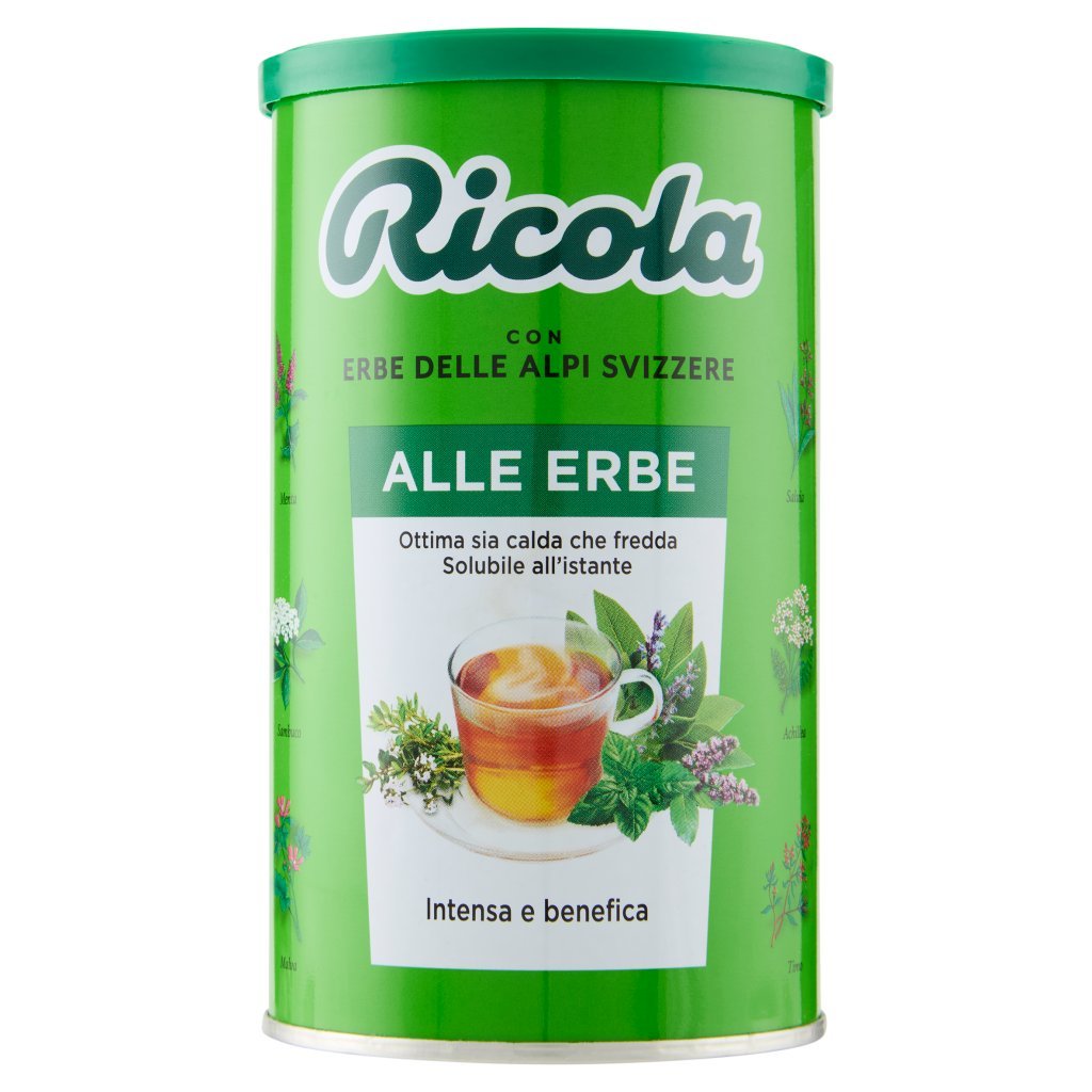 Zucchero, Destrosio, Estratto (2,7%) della miscela di erbe Ricola (piantaggine, altea, menta, timo, salvia, alchemilla, achillea, pimpinella, malva, sambuco, primula, veronica, marrubio), Zucchero caramellato, Aromi naturali di menta