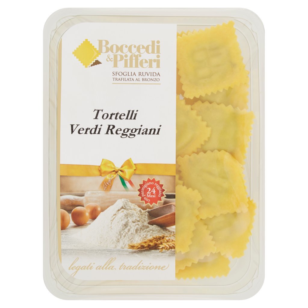 Pasta 50% - semola di grano duro, uovo 24%, Ripieno 50% - ricotta (siero di latte, crema di latte, sale), bieta 16%, spinaci 16%, Parmigiano-Reggiano 24 mesi 11,5% (latte, sale, caglio), farina di riso, lardo, cipolla, siero di latte, burro (contiene latte), sale, fibra vegetale, Allergeni: prodotto in uno stabilimento in cui si lavorano: sedano, crostacei, pesce, senape, soia, latte, molluschi, frutta a guscio