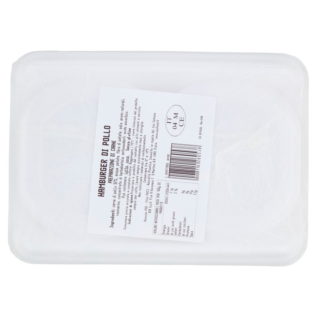 Carne di pollo 92%, Acqua, Patate, Fibra di patate, Sale, Aromi naturali, Rosmarino, Concentrato di barbabietola, Antiossidanti: acido ascorbico, Può contenere: latte, uova, Senza glutine