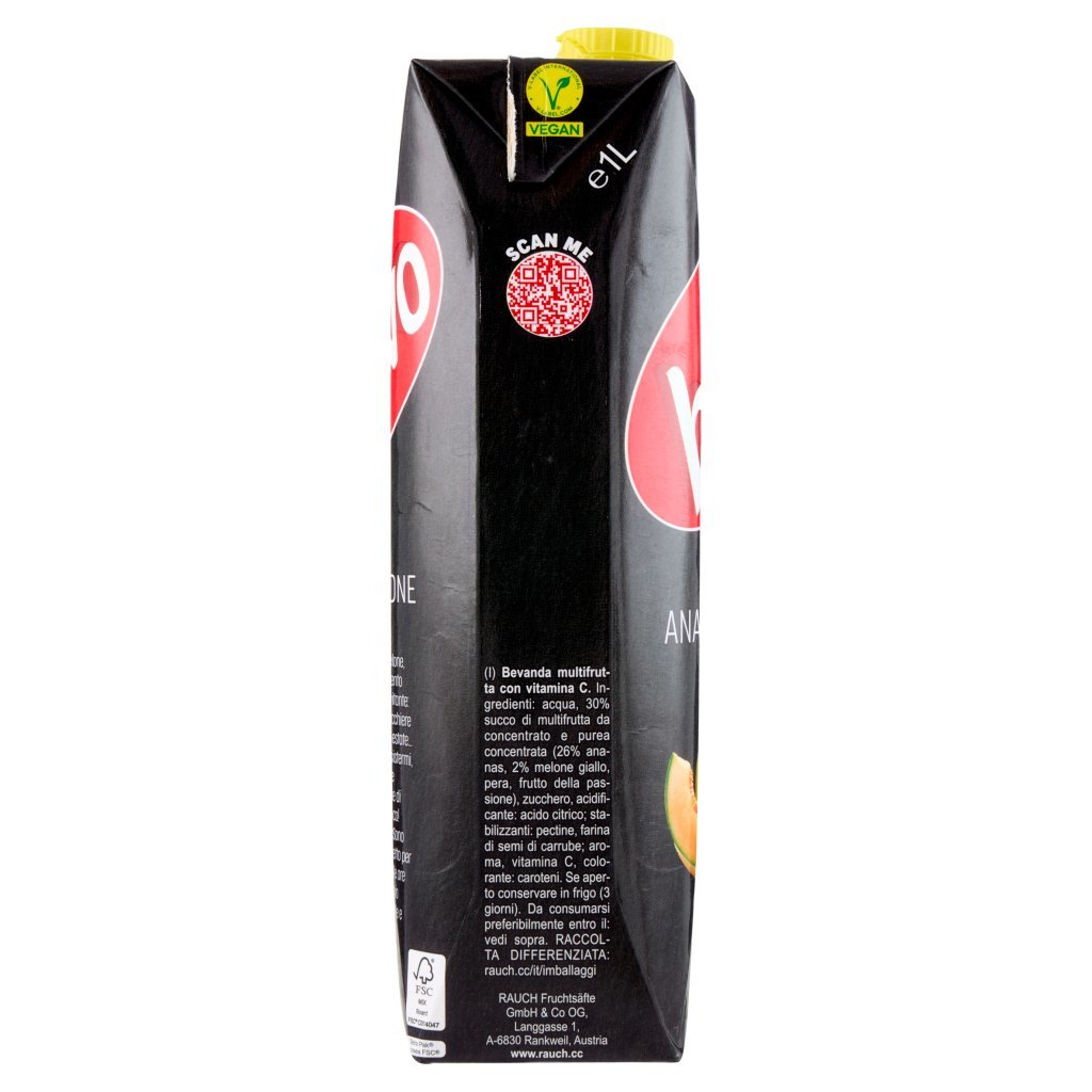 Acqua, 30% Succo di multifrutta da concentrato e purea concentrata (26% ananas, 2% melone giallo, pera, frutto della passione), Zucchero, Acidificante: acido citrico, Stabilizzanti: pectine, farina di semi di carrube, Aroma, Vitamina C, Colorante: caroteni