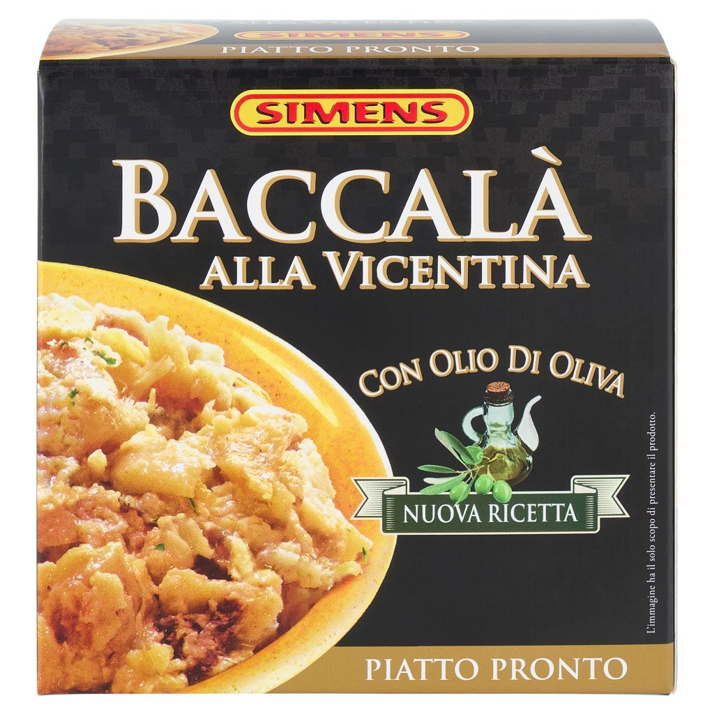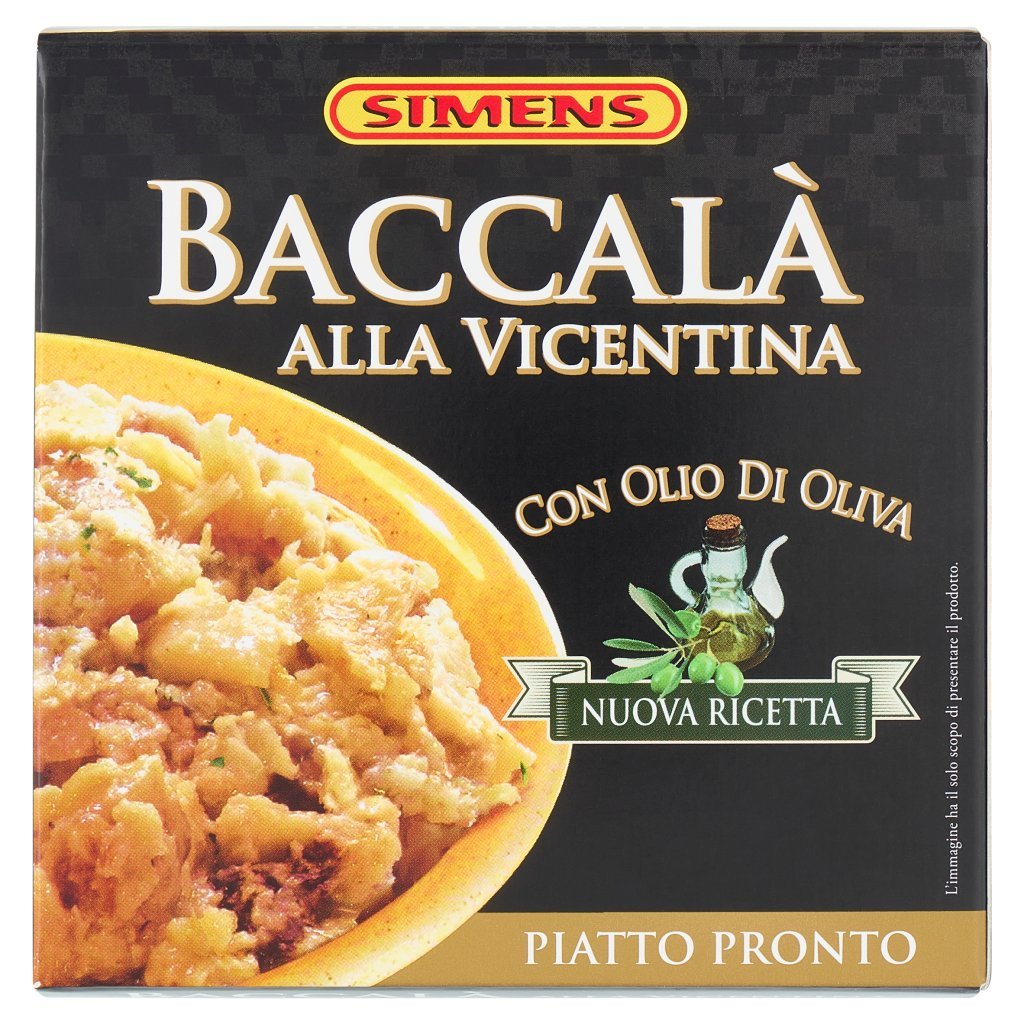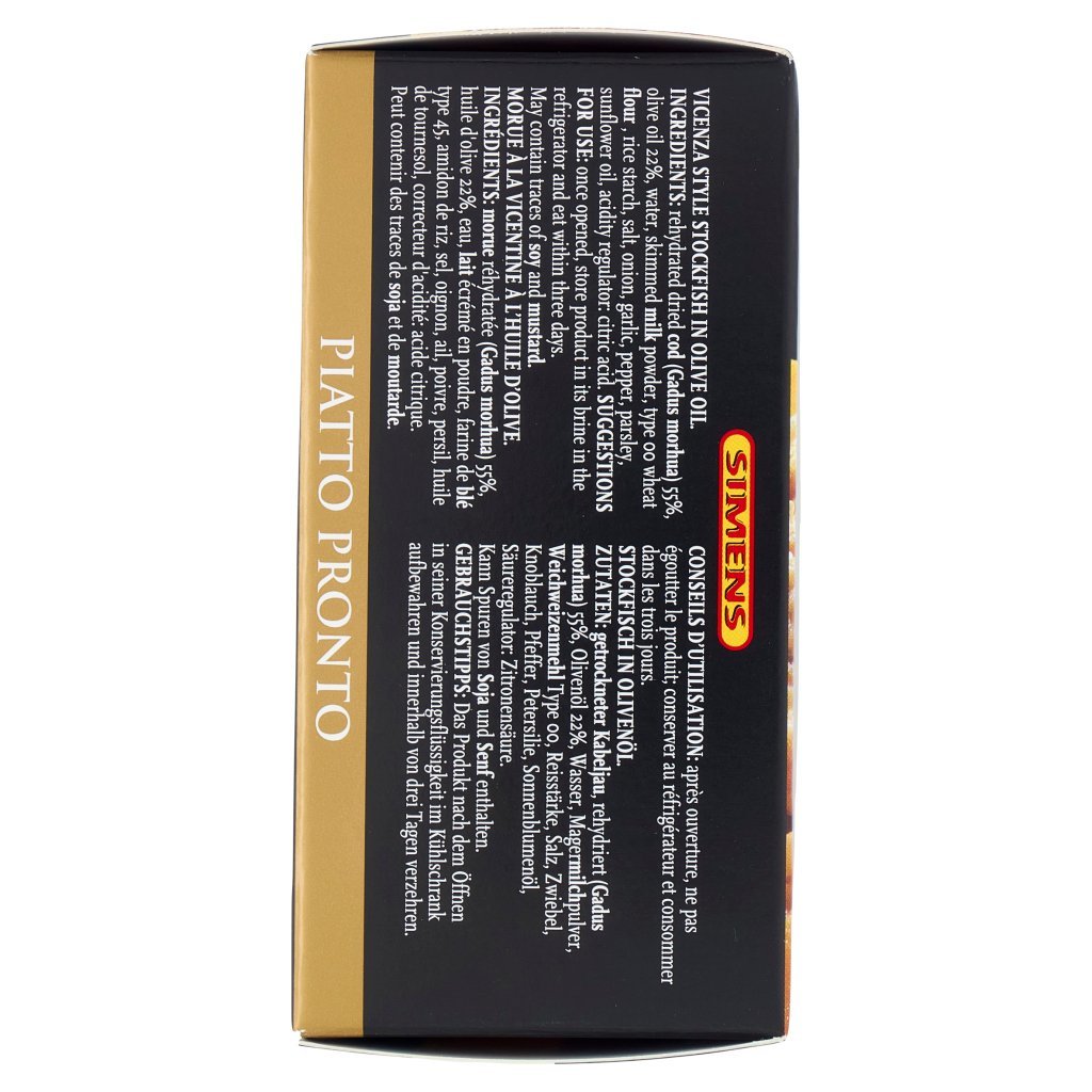 Stoccafisso reidratato (Gadus morhua) 55%, Olio di oliva 22%, Acqua, Latte scremato in polvere, Farina di grano tenero tipo '00', Amido di riso, Sale, Cipolla, Aglio, Pepe, Prezzemolo, Olio di girasole, Correttore di acidità: acido citrico, Può contenere tracce di soia e senape