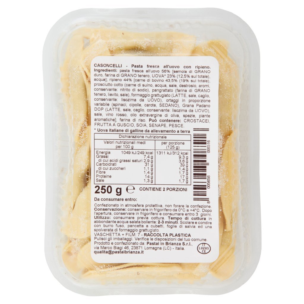 Pasta fresca all'uovo 56% [semola di GRANO duro, farina di GRANO tenero, UOVA* 23% (12,5% sul totale), acqua], Ripieno 44% [carne di bovino 43,5% (19% sul totale), prosciutto cotto (carne di suino, acqua, sale, destrosio, aromi, conservante: nitrito di sodio), pangrattato (farina di GRANO tenero, lievito, sale), formaggio grattugiato (LATTE, sale, caglio, conservante: lisozima da UOVO), ortaggi in proporzione variabile (spinaci, cipolle, carote, SEDANO), Grana Padano DOP (LATTE, sale, caglio, conservante: lisozima da UOVO), sale, vino rosso, olio extravergine di oliva, spezie, piante aromatiche], Farina di riso, Può contenere: CROSTACEI, FRUTTA A GUSCIO, SOIA, SENAPE, PESCE, * Uova italiane di galline da allevamento a terra