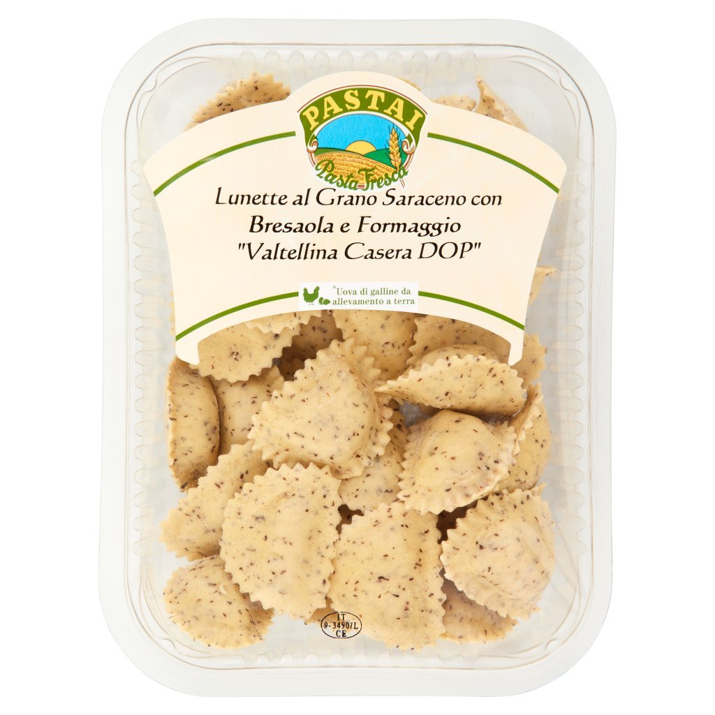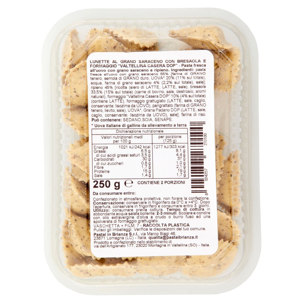 Pasta fresca all'uovo con grano saraceno 55% [farina di GRANO tenero, semola di GRANO duro, UOVA* 20% (11% sul totale), acqua, farina di grano saraceno 4% (2.2% sul totale), sale], Ripieno 45% [ricotta (siero di LATTE, LATTE, sale), bresaola 33.5% (15% sul totale) (carne di bovino, sale, destrosio, aromi naturali), formaggio 'Valtellina Casera DOP' 10% (4% sul totale) (contiene LATTE), formaggio grattugiato (LATTE, sale, caglio, conservante: lisozima da UOVO), pangrattato (farina di GRANO tenero, lievito, sale), uova*, Grana padano DOP (LATTE, sale, caglio, conservante: lisozima da UOVO), sale], Farina di riso, Può contenere: SEDANO, SOIA, SENAPE, *Uova italiane di galline da allevamento a terra