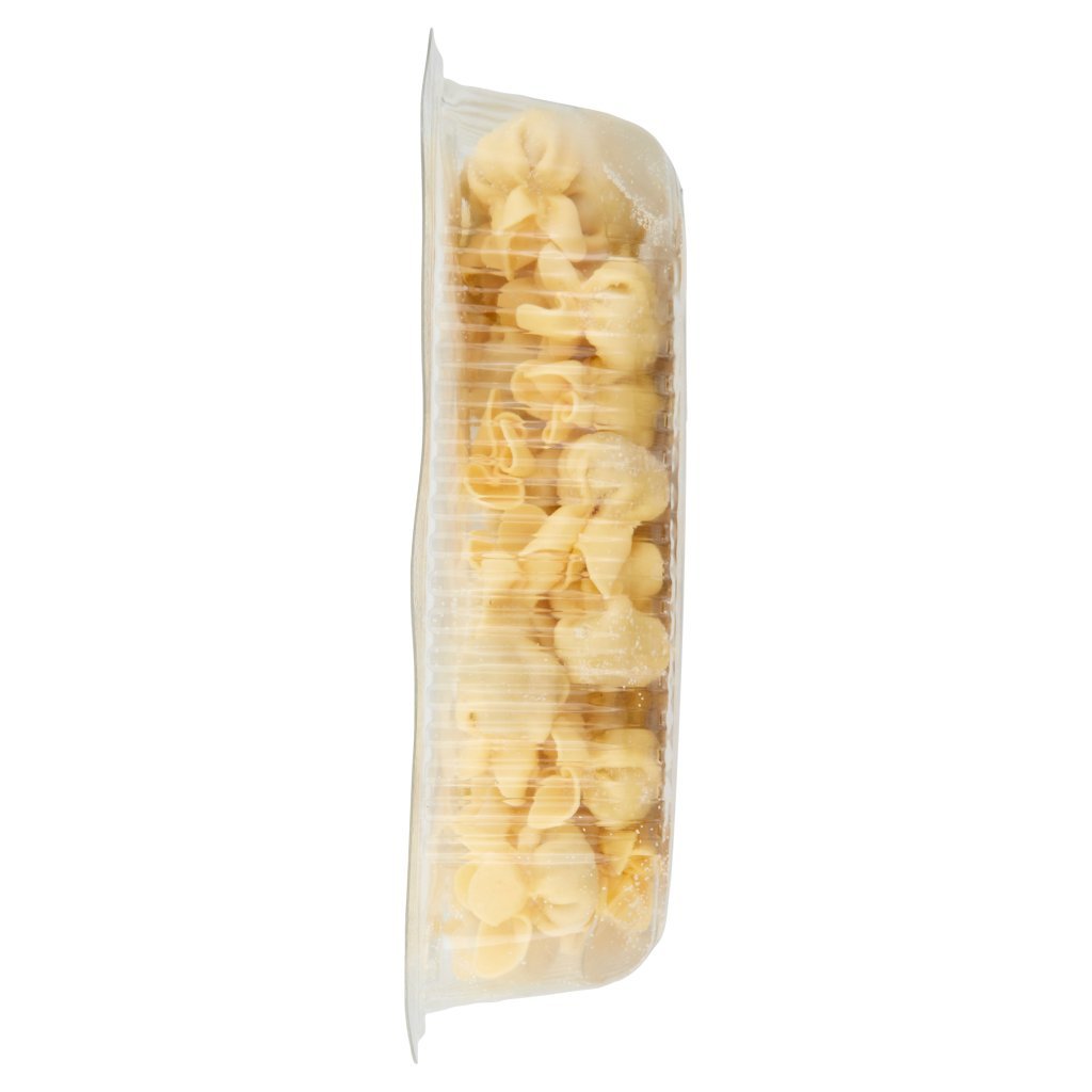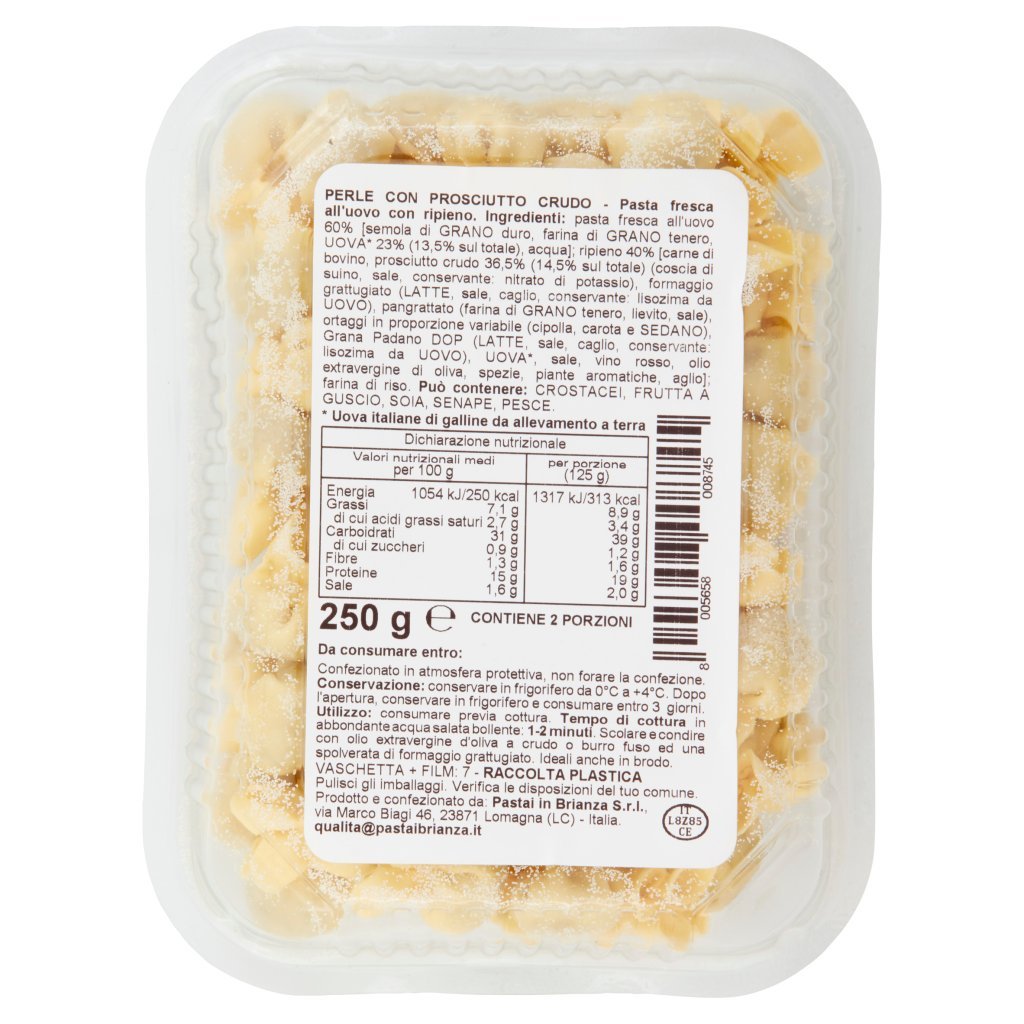 Pasta fresca all'uovo 60% [semola di GRANO duro, farina di GRANO tenero, UOVA* 23% (13,5% sul totale), acqua], Ripieno 40% [carne di bovino, prosciutto crudo 36,5% (14,5% sul totale) (coscia di suino, sale, conservante: nitrato di potassio), formaggio grattugiato (LATTE, sale, caglio, conservante: lisozima da UOVO), pangrattato (farina di GRANO tenero, lievito, sale), ortaggi in proporzione variabile (cipolla, carota e SEDANO), Grana Padano DOP (LATTE, sale, caglio, conservante: lisozima da UOVO), UOVA*, sale, vino rosso, olio extravergine di oliva, spezie, piante aromatiche, aglio], Farina di riso, Può contenere: CROSTACEI, FRUTTA A GUSCIO, SOIA, SENAPE, PESCE, * Uova italiane di galline da allevamento a terra