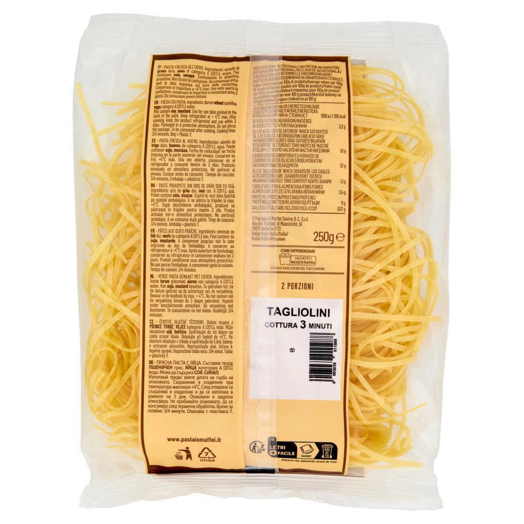 Semola di grano duro, Uova di categoria A (20%), Acqua, Può contenere soia, senape