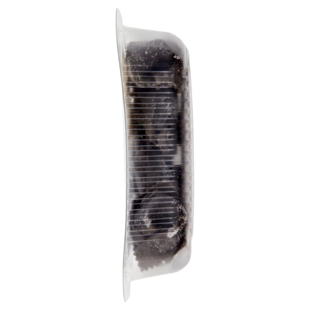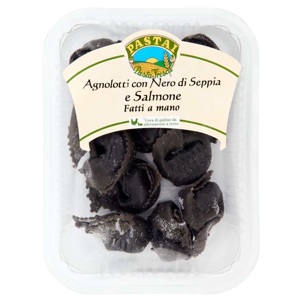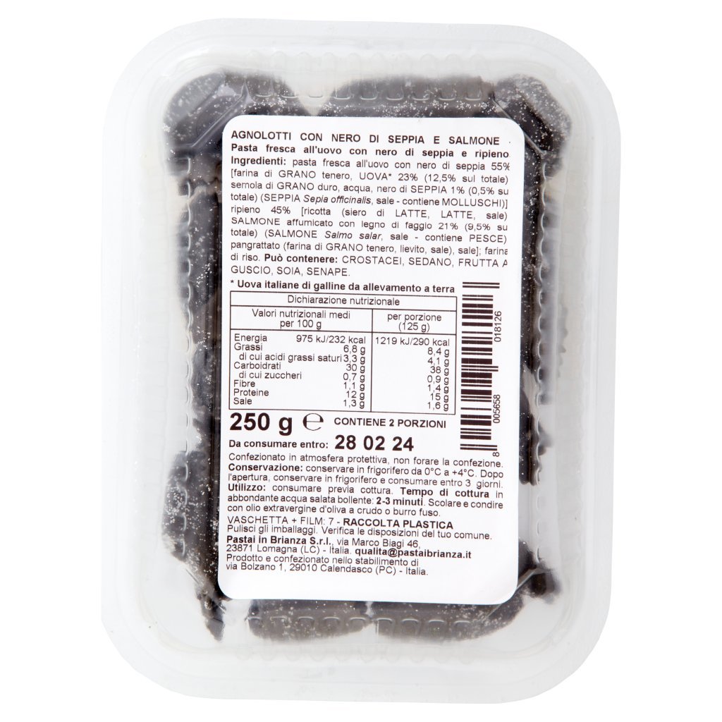 Pasta fresca all'uovo con nero di seppia 55% [farina di GRANO tenero, UOVA* 23% (12,5% sul totale), semola di GRANO duro, acqua, nero di SEPPIA 1% (0,5% sul totale) (SEPPIA Seppia officinalis, sale - contiene molluschi)], Ripieno 45% [ricotta (siero di LATTE, LATTE, sale), SALMONE affumicato con legno di faggio 21% (9,5% sul totale) (SALMONE Salmo salar, sale - contiene PESCE), pangrattato (farina di GRANO tenero, lievito, sale), sale], Farina di riso, Può contenere: CROSTACEI, SEDANO, FRUTTA A GUSCIO, SOIA, SENAPE, * Uova italiane di galline da allevamento a terra