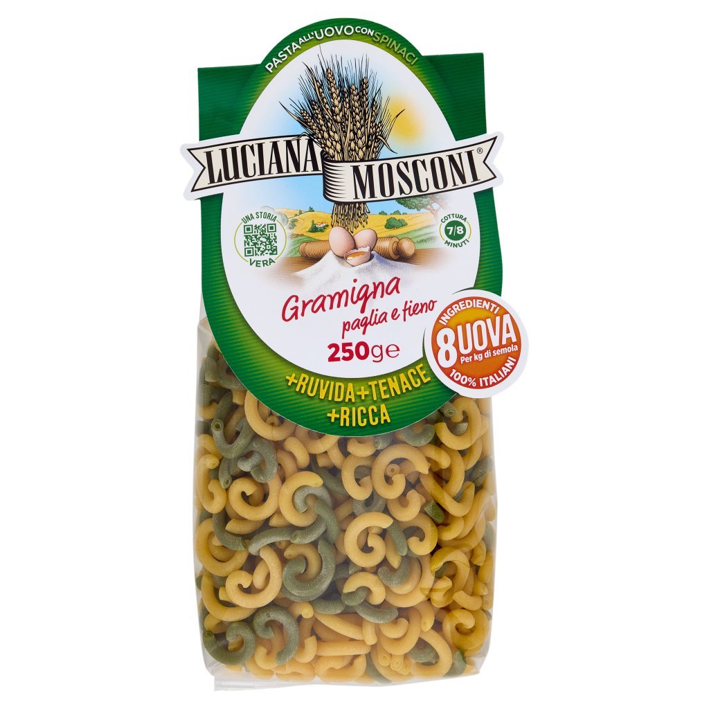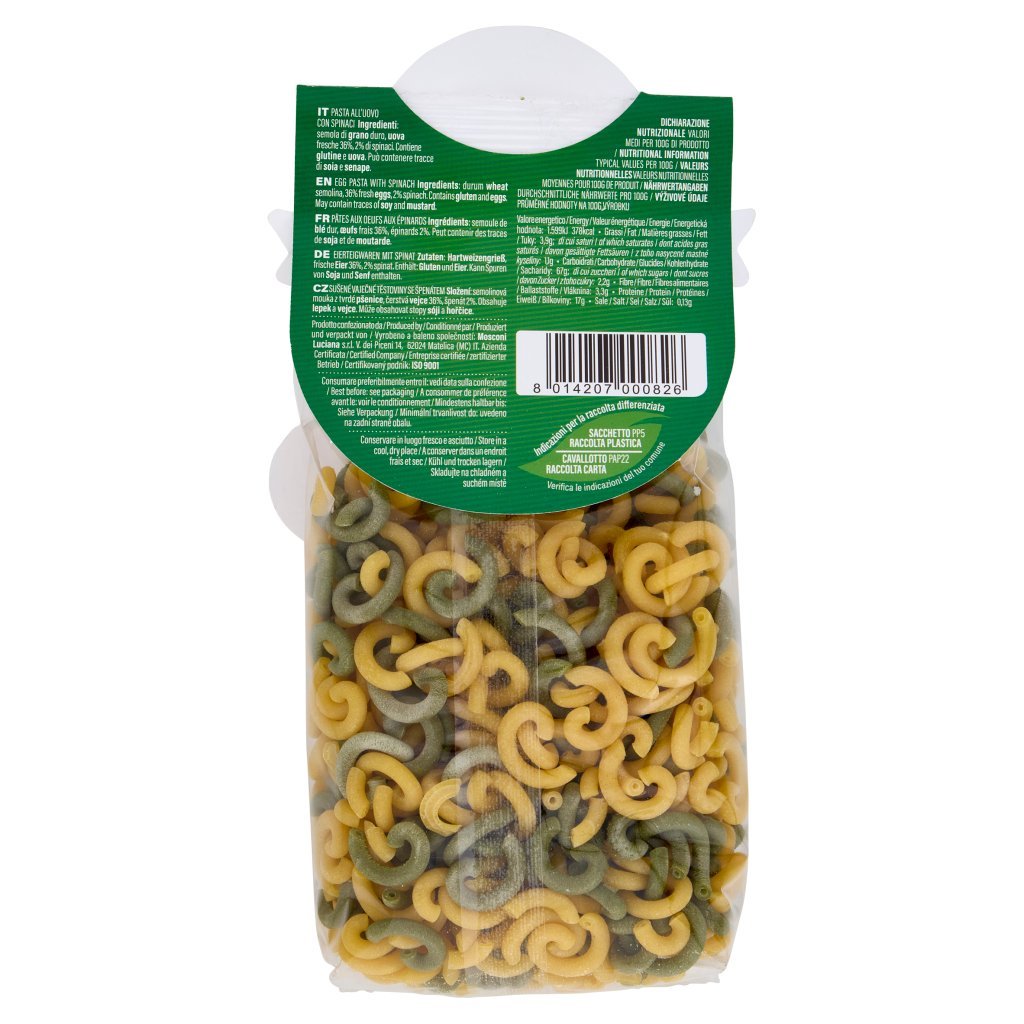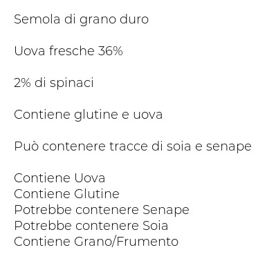 Semola di grano duro, Uova fresche 36%, 2% di spinaci, Contiene glutine e uova, Può contenere tracce di soia e senape
