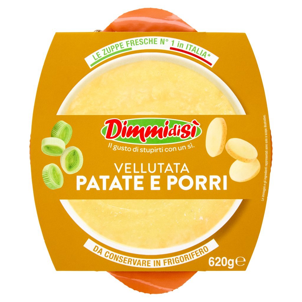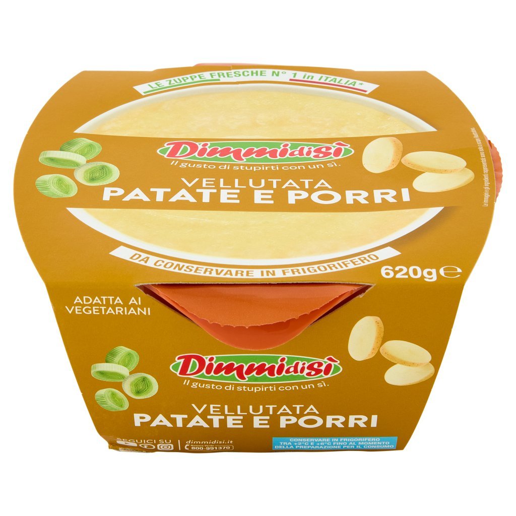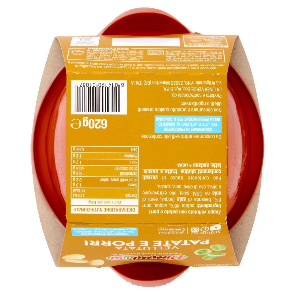 Patate 46%, Acqua, Porri 6%, Bevanda di soia (acqua, semi di soia no OGM, sale), Olio extravergine d'oliva, Olio di oliva, Sale, Spezia, Può contenere tracce di cereali contenenti glutine, frutta a guscio, latte, sedano e uova