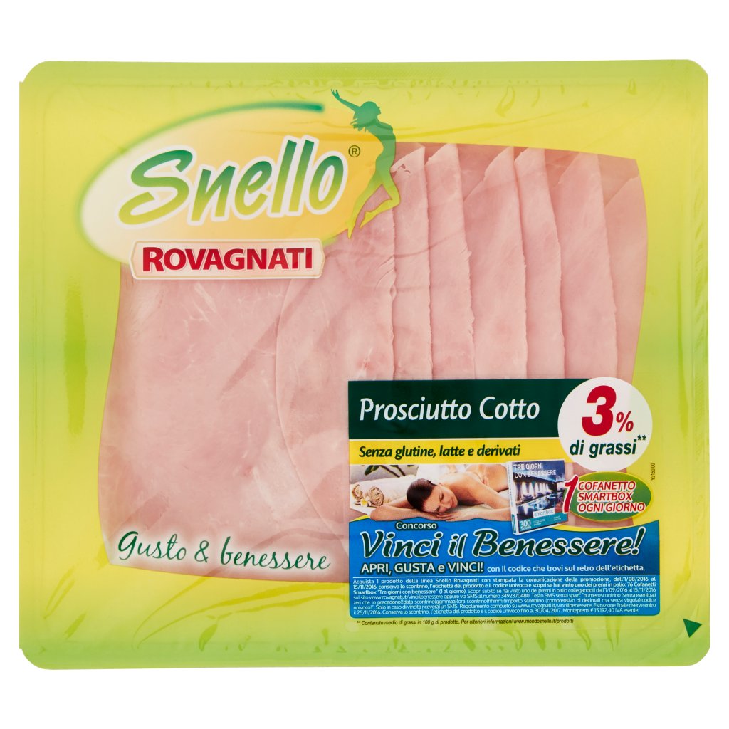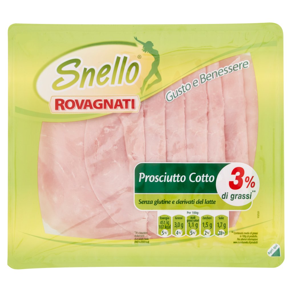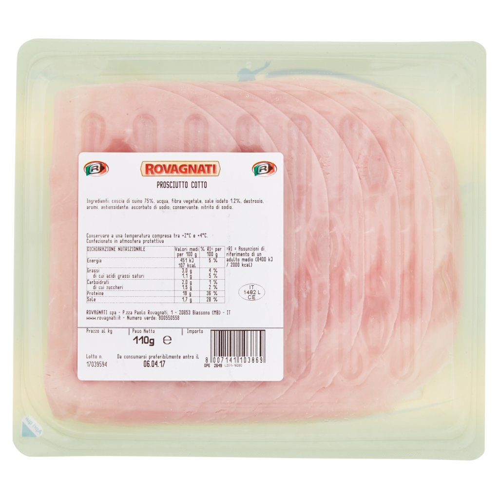 Coscia di suino 75%, Acqua, Fibra vegetale, Sale iodato 1,2%, Destrosio, Aromi, Antiossidante: ascorbato di sodio, Conservante: nitrito di sodio