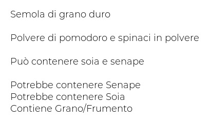 Semola di grano duro, Polvere di pomodoro e spinaci in polvere, Può contenere soia e senape