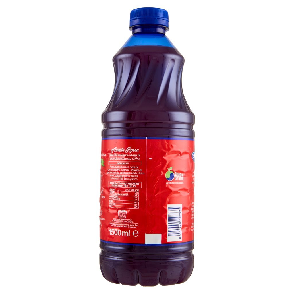 Acqua, Succo di arancia rossa da concentrato 25%, Zucchero, Sciroppo di glucosio-fruttosio, Acidificante: acido citrico, Aromi, Estratto di ribes e carota, Colorante: E120, Senza glutine