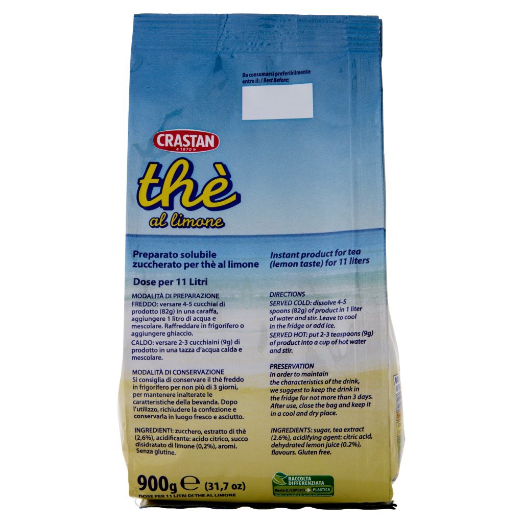 Zucchero, Estratto di thè (2,6%), Acidificante: acido citrico, Succo disidratato di limone (0,2%), Aromi, Senza glutine