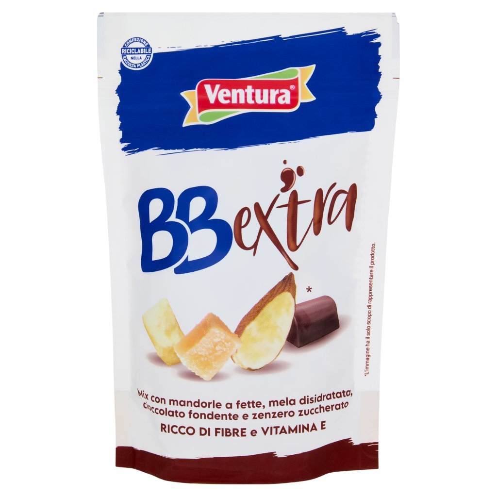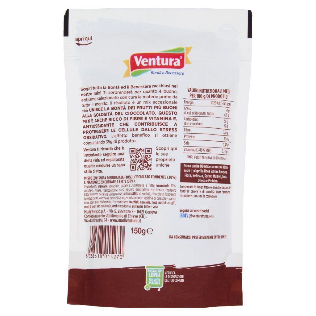 Mandorle sgusciate, tostate e zuccherate a fette (mandorle 77%, zucchero, miele, maltodestrine, sale), Zenzero disidratato zuccherato (zenzero 68%, zucchero di canna, conservante: metabisolfito di sodio), Cioccolato fondente (pasta di cacao, zucchero, burro di cacao, emulsionante: lecitina di girasole - cacao min. 50%), Mela disidratata, Può contenere arachidi, nocciole, noci, noci di acagiù, noci di pecan, noci del Brasile, noci macadamia, pistacchi, latte e soia