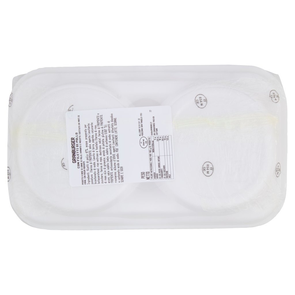 Filetti di pollo 47%, Acqua, Preparato per panatura (farina di frumento, sale, agente lievitante: bicarbonato di sodio, lievito di birra, paprika, colorante: betacarotene), Riso estruso e tostato (farina di riso, zucchero, farina di mais, destrosio, sale), Farine di frumento e di mais olio di girasole, Amido di patata, Glutine di frumento, Aromi, Sale iodato (sale, iodato di potassio 0,007%), Frumento, Antiossidante: ascorbato di sodio, estratti di rosmarino, Albume d'uovo, Agenti lievitanti: difosfato disodico e carbonato acido di sodio, Può contenere latte, sedano, senape e soia