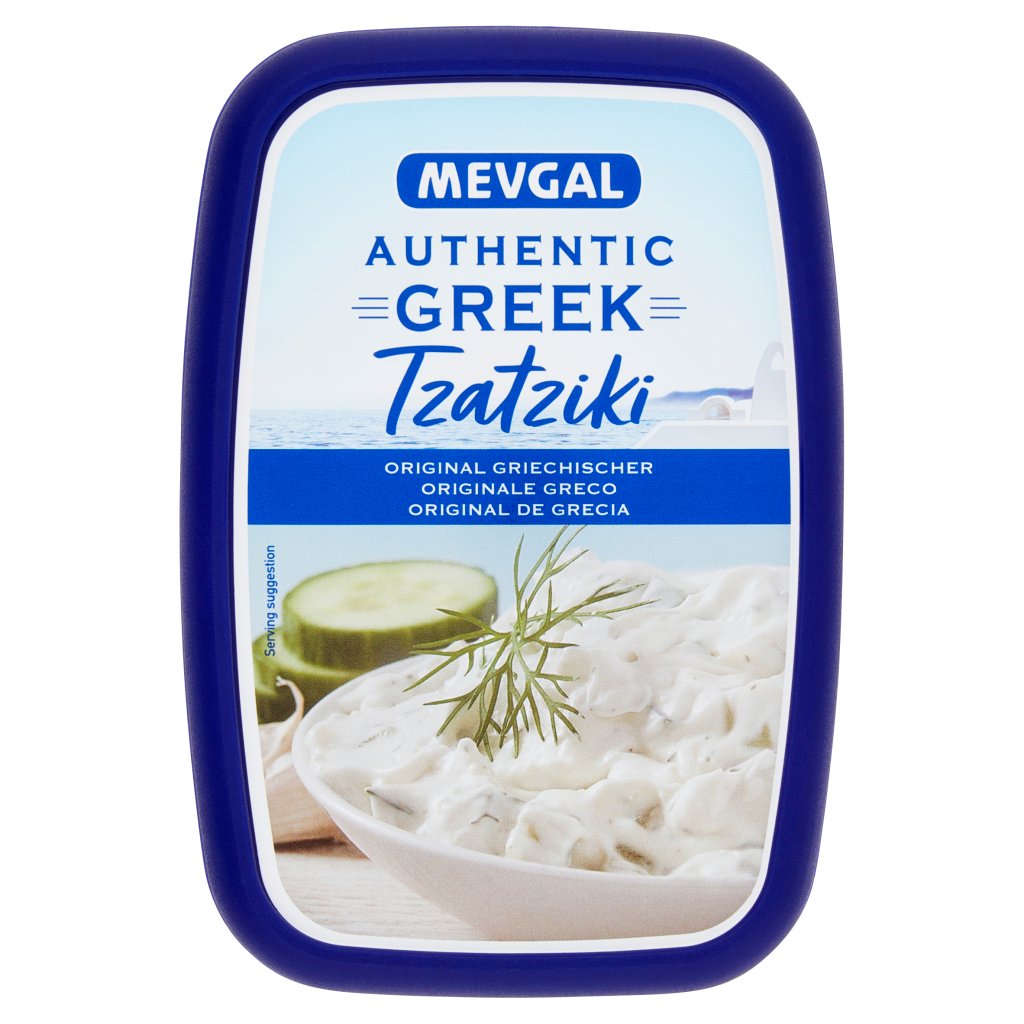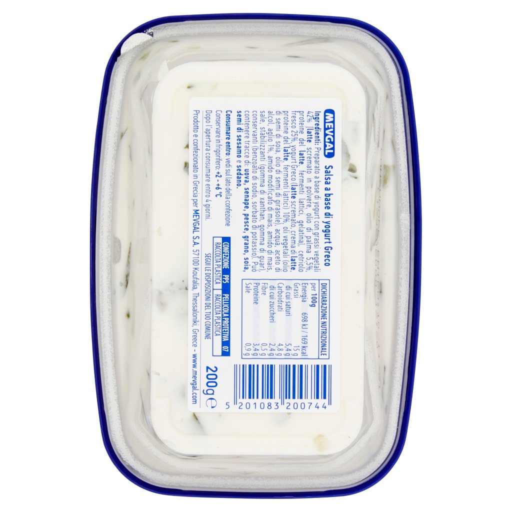 Preparato a base di yogurt con grassi vegetali 42% [latte scremato in polvere, olio di palma 5,5%, proteine del latte, fermenti lattici, gelatina], Cetriolo fresco 25%, Yogurt greco (latte scremato, crema di latte, proteine del latte, fermenti lattici) 10%, Oli vegetali (olio di semi di soia, olio di semi di girasole), Acqua, Aceto di alcol, Aglio 1%, Amido modificato di mais, Amido di mais, Sale, Stabilizzanti (gomma di xanthan, gomma di guar), Conservanti (benzoato di sodio, sorbato di potassio), Può contenere tracce di: uova, senape, pesce, grano, soia, semi di sesamo e sedano