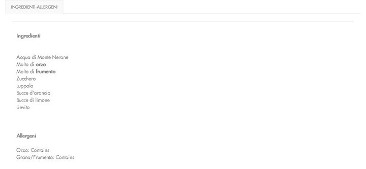 Acqua, Malto d'orzo, Malto di frumento, Zucchero, Luppolo, Bucce d'arancia, Bucce di limone, Lievito