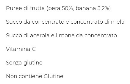 Puree di frutta (pera 50%, banana 3,2%), Succo da concentrato e concentrato di mela, Succo di acerola e limone da concentrato, Vitamina C, Senza glutine