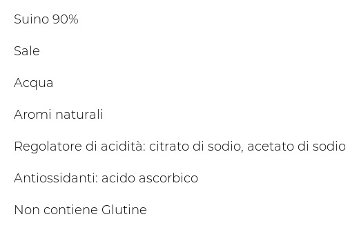 Suino 90%, Sale, Acqua, Aromi naturali, Regolatore di acidità: citrato di sodio, acetato di sodio, Antiossidanti: acido ascorbico