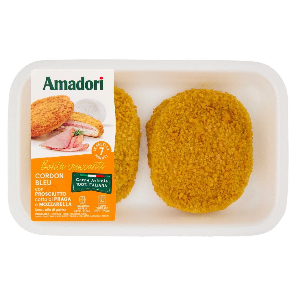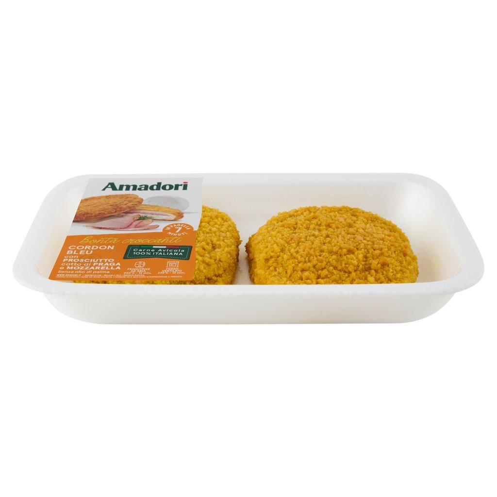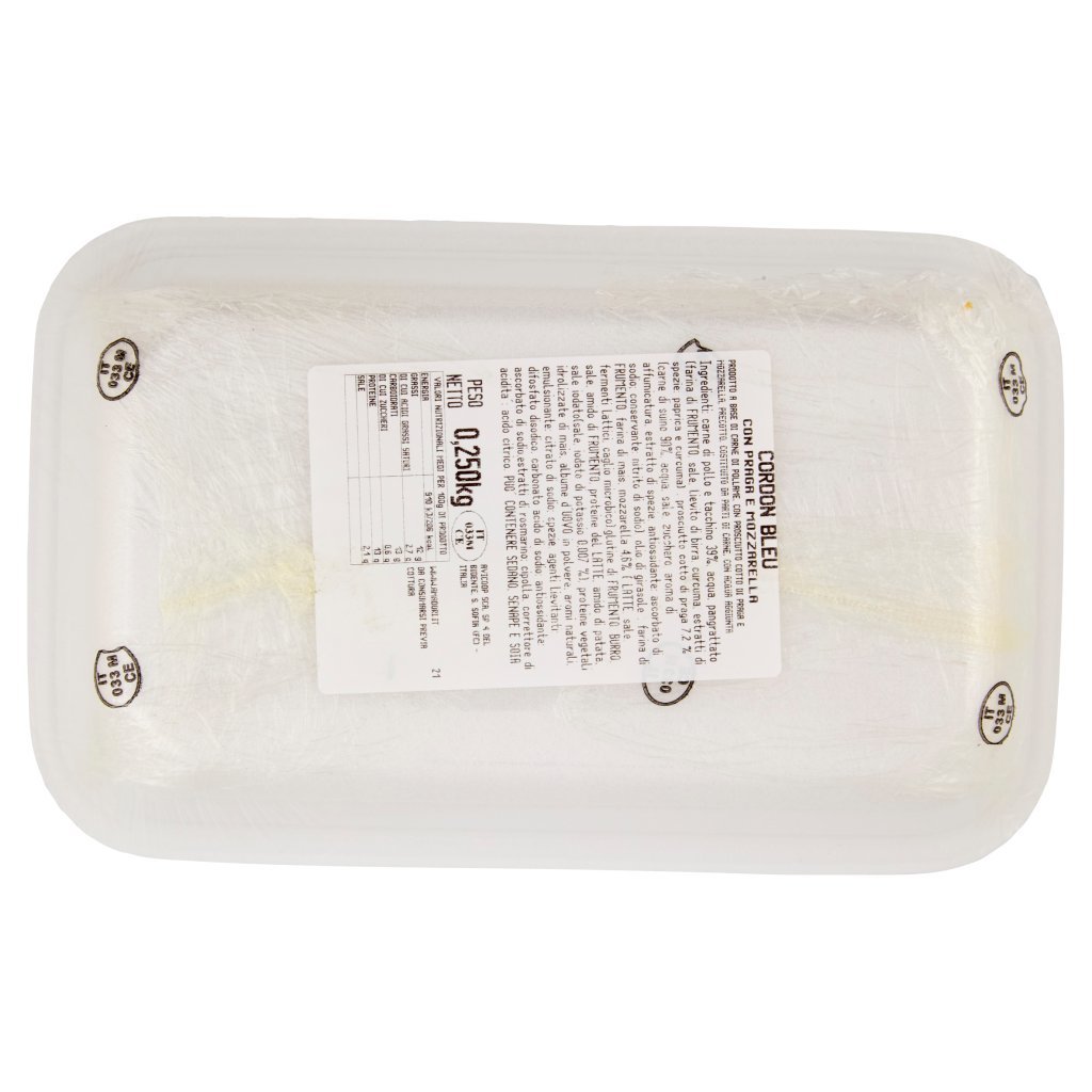 Carne di pollo e tacchino 39%, Acqua, Pangrattato (farina di frumento, sale, lievito di birra, curcuma, estratti di spezie: paprica e curcuma), Prosciutto cotto di praga 7,2 % (carne di suino 90%, acqua, sale, zucchero, aroma di affumicatura, estratto di spezie, antiossidante: ascorbato di sodio; conservante: nitrito di sodio), Olio di girasole, Farina di frumento, Farina di mais, Mozzarella 4,6% (latte, sale, fermenti lattici, caglio microbico), Glutine di frumento, Burro, Sale, Amido di frumento, Proteine del latte, Amido di patata, Sale iodato(sale, iodato di potassio 0,007 %), Proteine vegetali idrolizzate di mais, Albume d'uovo in polvere, Aromi naturali, Emulsionante: citrato di sodio, Spezie, Agenti lievitanti: difosfato disodico, carbonato acido di sodio, Antiossidante: ascorbato di sodio, estratti di rosmarino, Cipolla, Correttore di acidità: acido citrico, Può contenere sedano, senape e soia