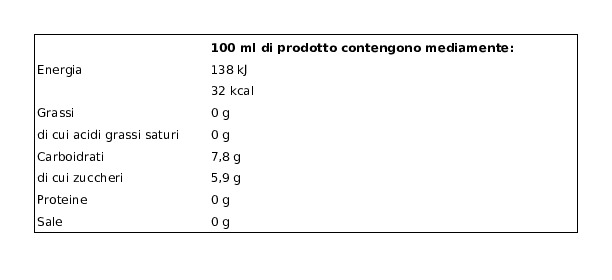 Frutta 65% (purea di pesca 40%, succo di mela da concentrato 25%), Acqua, Aromi naturali, Senza glutine
