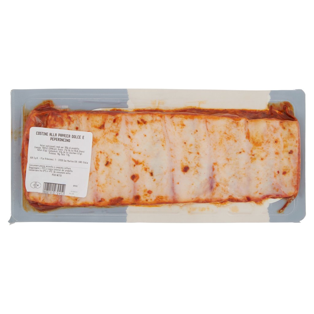 Costato di suino 97%, Sale, Zucchero, Paprika, Peperoncino, Farina di riso, Spezie, Piante aromatiche, Aglio in polvere, Antiossidanti: ascorbato di sodio, Estratto di spezie, Aromi, Estratto di lievito, Aroma di affumicatura, Può contenere: senape
