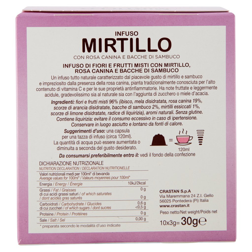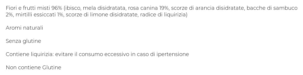 Fiori e frutti misti 96% (ibisco, mela disidratata, rosa canina 19%, scorze di arancia disidratate, bacche di sambuco 2%, mirtilli essiccati 1%, scorze di limone disidratate, radice di liquirizia), Aromi naturali, Senza glutine, Contiene liquirizia: evitare il consumo eccessivo in caso di ipertensione