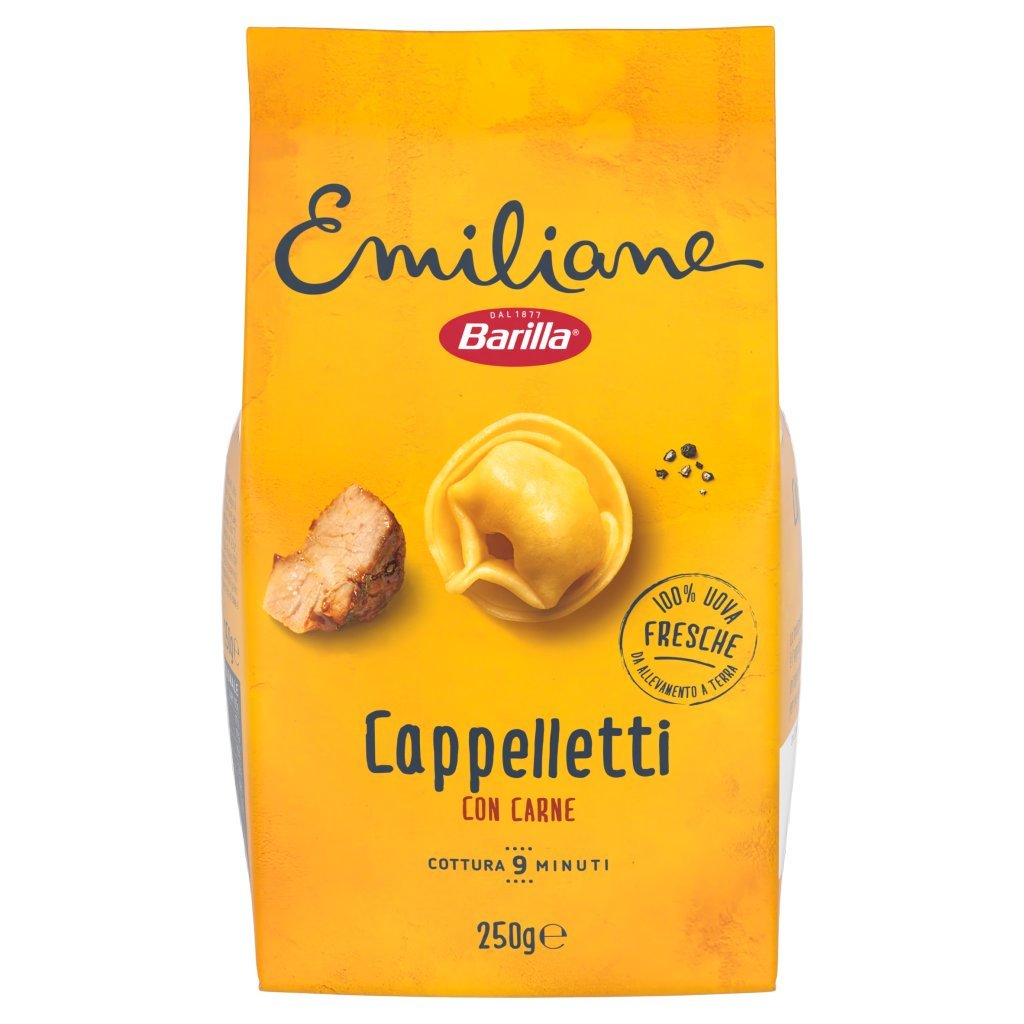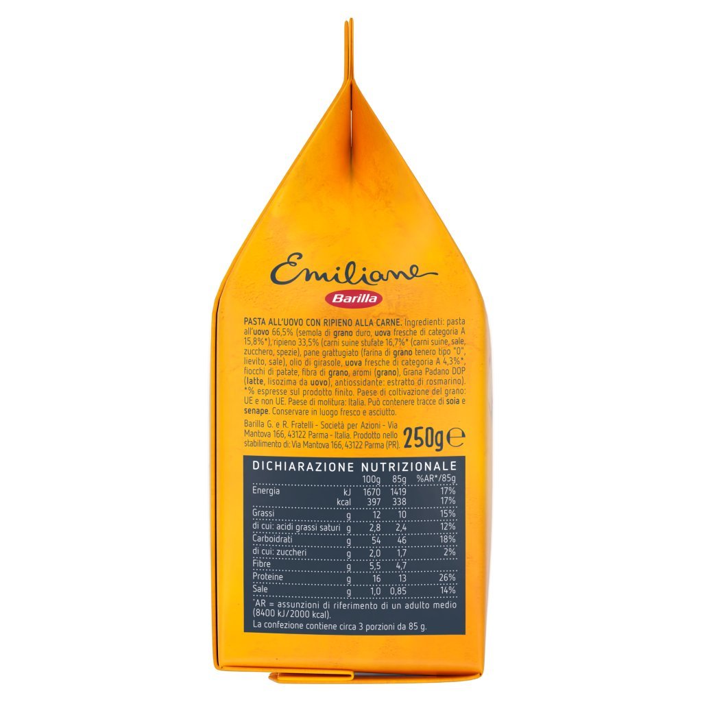 Pasta all'uovo 66,5% (semola di grano duro, uova fresche di categoria A 15,8%*), Ripieno 33,5% (carni suine stufate 16,7%* (carni suine, sale, zucchero, spezie), pane grattugiato (farina di grano tenero tipo '0', lievito, sale), olio di girasole, uova fresche di categoria A 4,3%*, fiocchi di patate, fibra di grano, aromi (grano), Grana Padano DOP (latte, lisozima da uovo), antiossidante: estratto di rosmarino), *% Espresse sul prodotto finito, Può contenere tracce di soia e senape