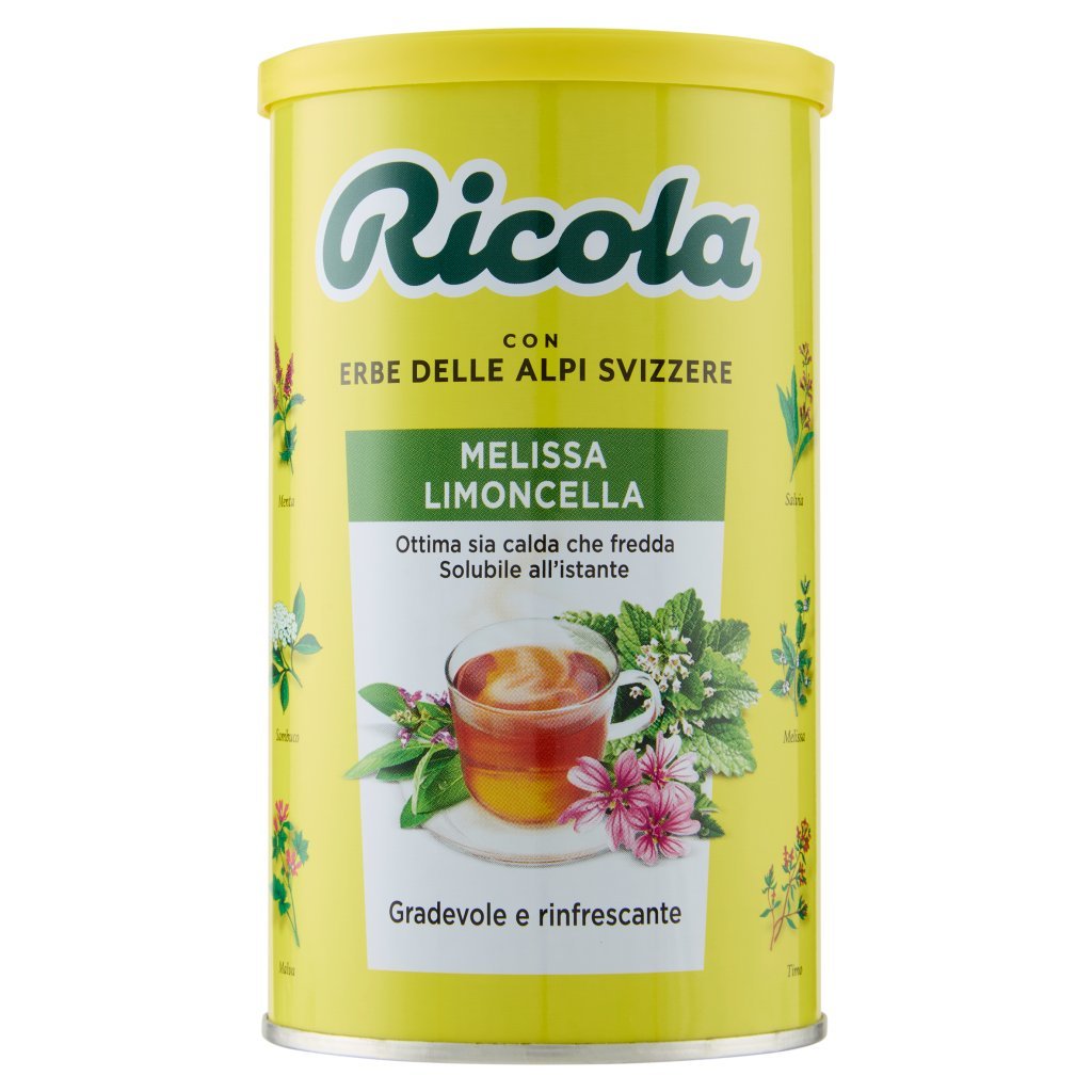 Zucchero, Destrosio, Estratti (2,9%) di melissa e della miscela di erbe Ricola (piantaggine, altea, menta, timo, salvia, alchemilla, achillea, pimpinella, malva, sambuco, primula, veronica, marrubio), Acidificante (acido citrico), Concentrato di succo di limone, Zucchero caramellato, Aromi naturali di agrume, Aromi naturali di menta, Aromi naturali