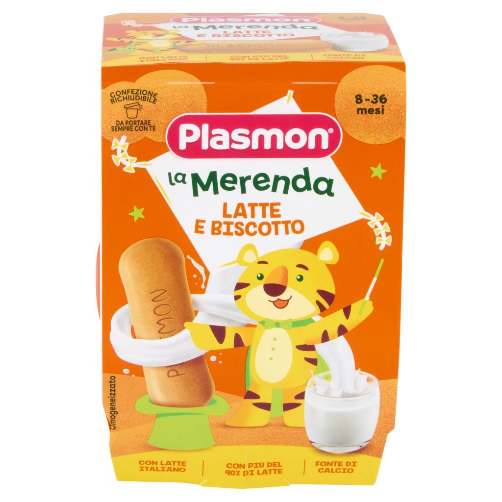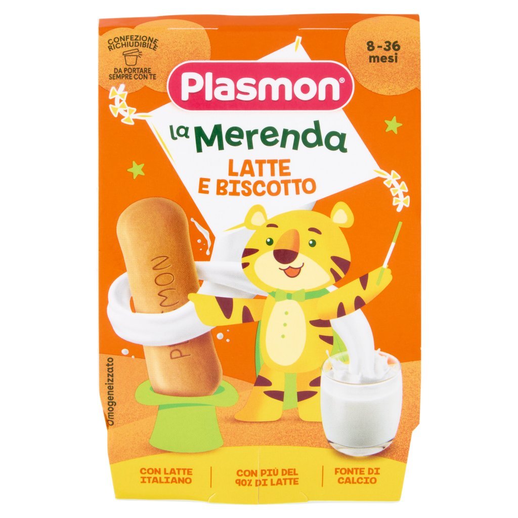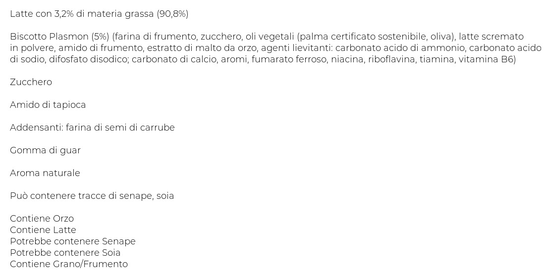 Latte con 3,2% di materia grassa (90,8%), Biscotto Plasmon (5%) (farina di frumento, zucchero, oli vegetali (palma certificato sostenibile, oliva), latte scremato in polvere, amido di frumento, estratto di malto da orzo, agenti lievitanti: carbonato acido di ammonio, carbonato acido di sodio, difosfato disodico; carbonato di calcio, aromi, fumarato ferroso, niacina, riboflavina, tiamina, vitamina B6), Zucchero, Amido di tapioca, Addensanti: farina di semi di carrube, Gomma di guar, Aroma naturale, Può contenere tracce di senape, soia
