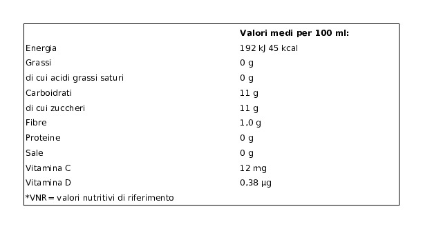 Purea di pesca 50% (minimo 15% pesca nettarina), Acqua, Zucchero, Acidificante: acido citrico, Aromi naturali, Vitamine C e D