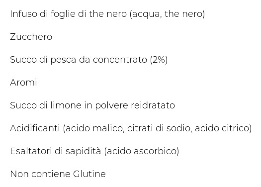 Infuso di foglie di the nero (acqua, the nero), Zucchero, Succo di pesca da concentrato (2%), Aromi, Succo di limone in polvere reidratato, Acidificanti (acido malico, citrati di sodio, acido citrico), Esaltatori di sapidità (acido ascorbico)