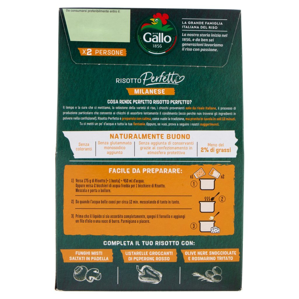 Riso parboiled 92%, Fecola di patate, Maltodestrina, Formaggio fuso, Amido di riso, Cipolla, Zucchero, Estratto di lievito, Sale, Aromi naturali, Zafferano 0,03%