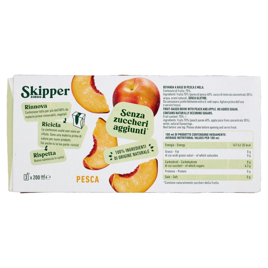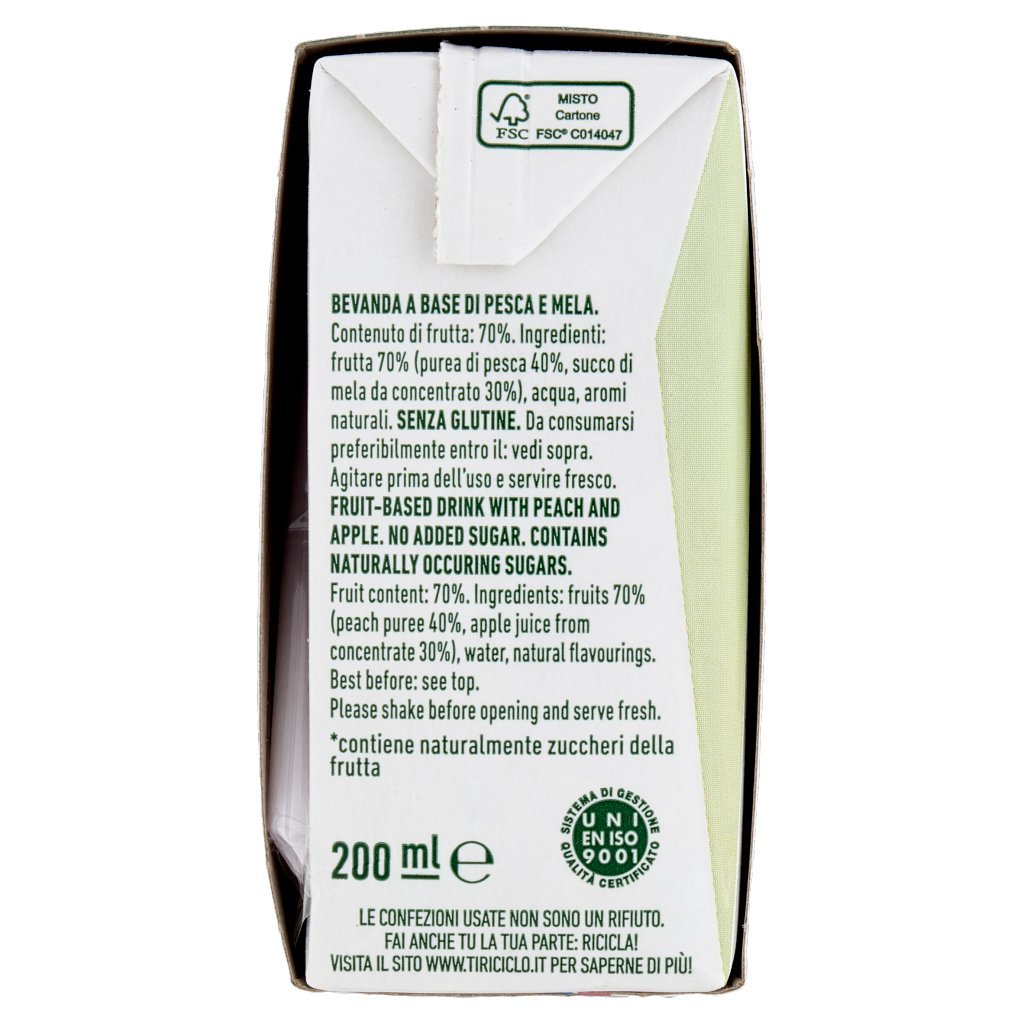 Frutta 70% (purea di pesca 40%, succo di mela da concentrato 30%), Acqua, Aromi naturali, Senza glutine