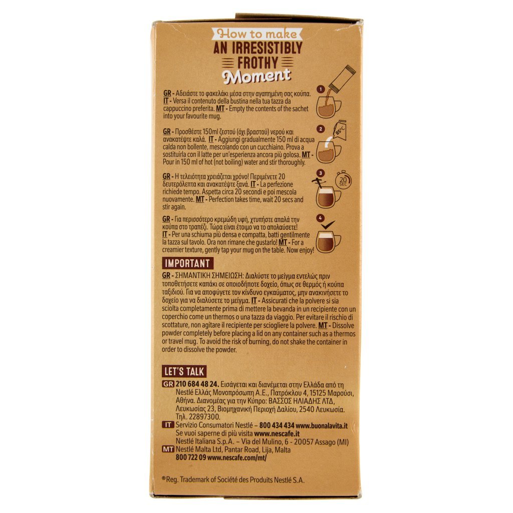 Zucchero°, Sciroppo di glucosio°, Latte scremato in polvere° (20,6%), Caffè solubile° (11,7%), Olio vegetale (cocco), Lattosio°, Correttori di acidità (carbonati di sodio, acido citrico), Sale, Aroma naturale°, °Ingredienti di origine naturale, Senza glutine