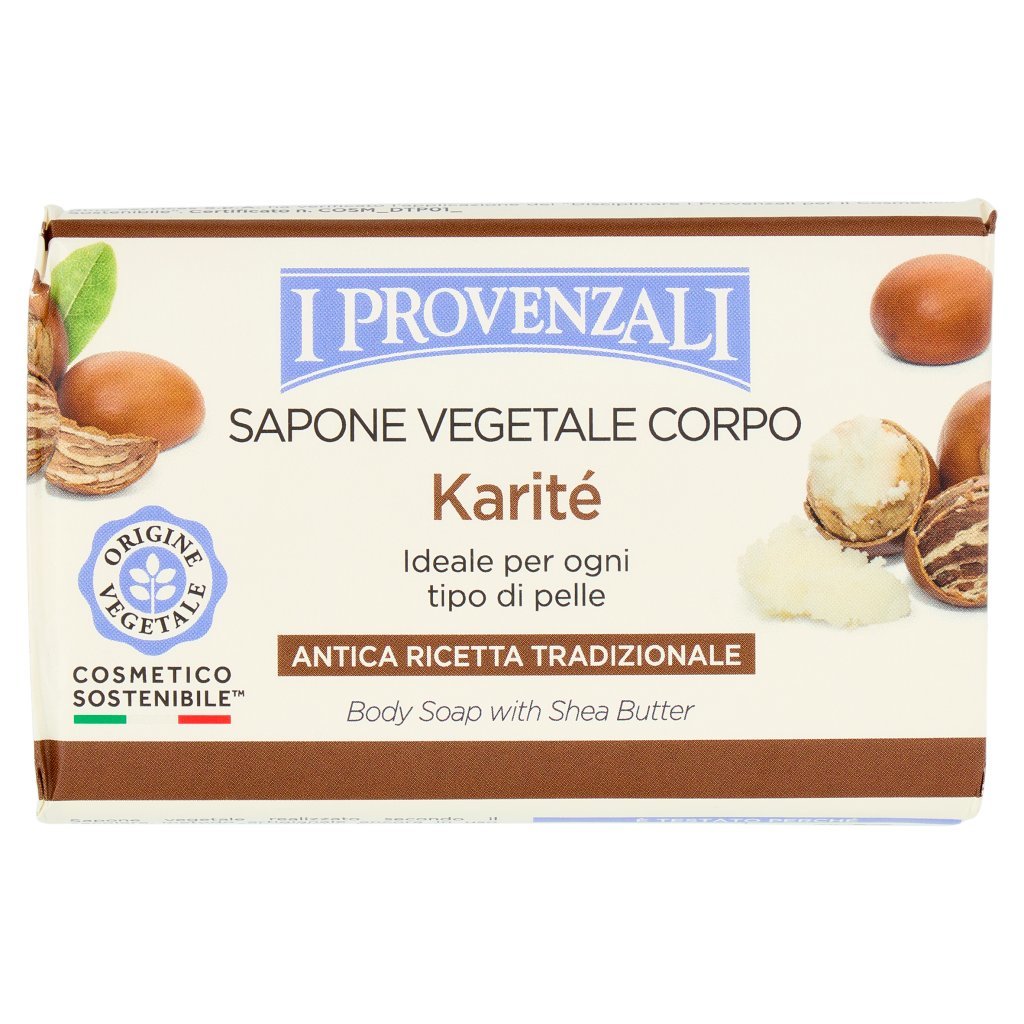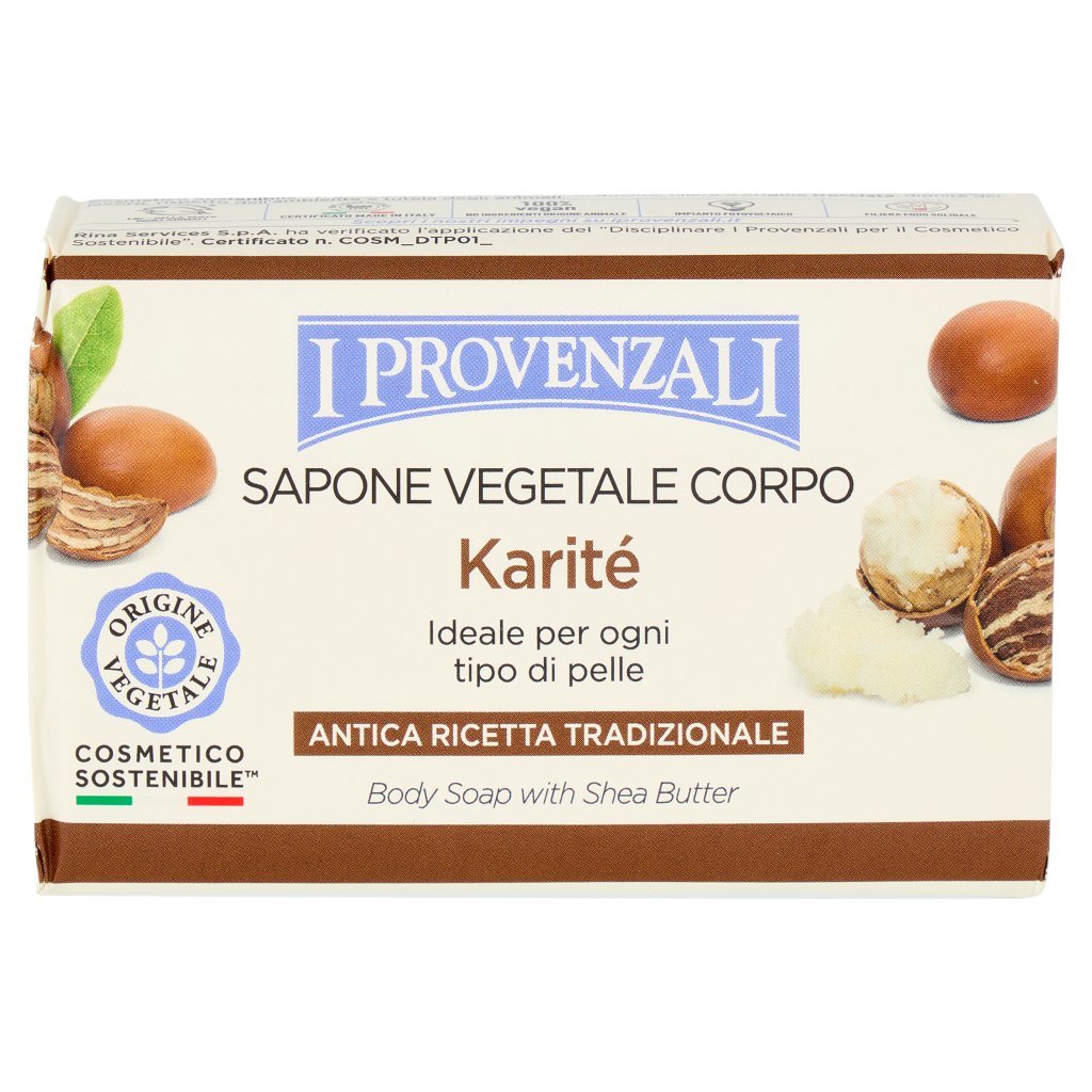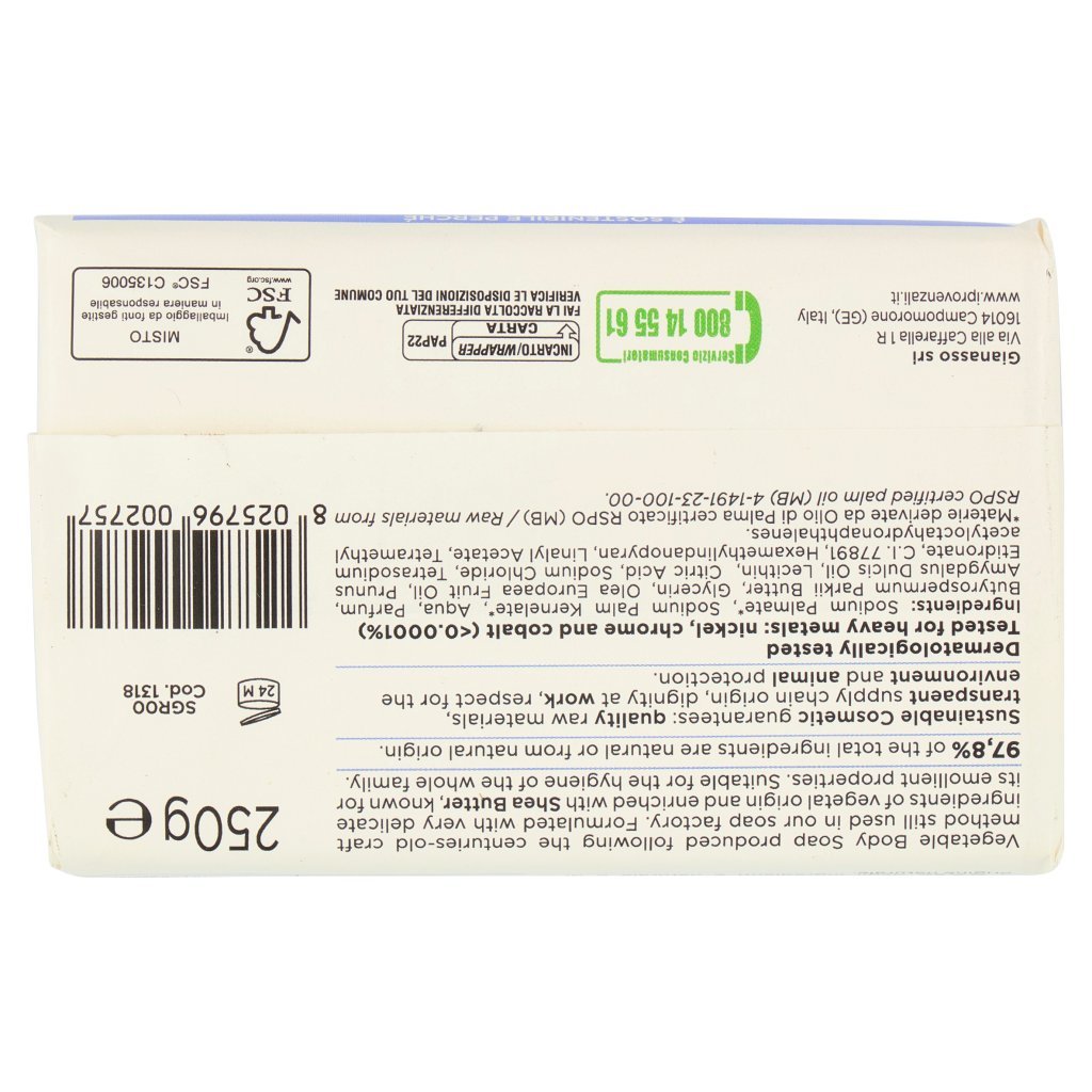 Sodium Palmate*, Sodium Palm Kernelate*, Aqua, Parfum, Butyrospermum Parkii Butter, Glycerin, Olea Europaea Fruit Oil, Prunus Amygdalus Dulcis Oil, Lecithin, Citric Acid, Sodium Chloride, Tetrasodium Etidronate, C.I. 77891, Hexamethylindanopyran, Linalyl Acetate, Tetramethyl acetyloctahydronaphthalenes, *Materie derivate da Olio di Palma certificato RSPO (MB) 4-1491-23-100-00