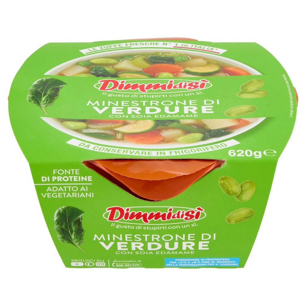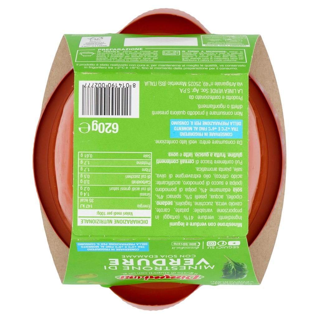 Verdure 41% (ortaggi in proporzione variabile: patate, carote, cavolo verza, zucchine, fagiolini, sedano, cipolle), Acqua, Piselli 5%, Spinaci 4%, Soia edamame 4%, Polpa di pomodoro (polpa e succo di pomodoro, acidificante: acido citrico), Olio extravergine di oliva, Sale, Pianta aromatica, Può contenere tracce di cereali contenenti glutine, frutta a guscio, latte e uova