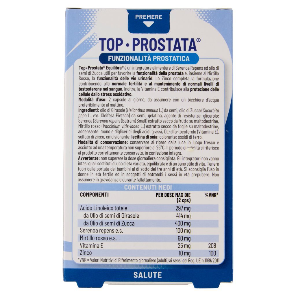 Olio di girasole (Helianthus annuus L.) da semi, Olio di zucca (Cucurbita pepo L. var. Oleifera Pietsch) da semi, Gelatina, Agente di resistenza: glicerolo, Serenoa (Serenoa repens (Bartram) Small) estratto secco da frutto su maltodestrine, Mirtillo rosso (Vaccinium vitis-idaea L.) estratto secco da foglie su maltodestrine, Addensante: mono e digliceridi degli acidi grassi, DL-alfa-tocoferolo (Vitamina E), Solfato di zinco, Emulsionante: lecitina di soia, Colorante: ossidi di ferro