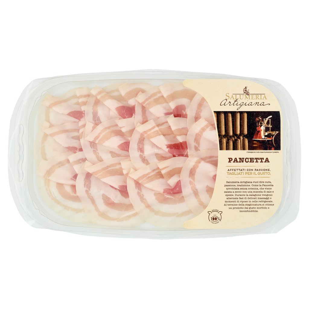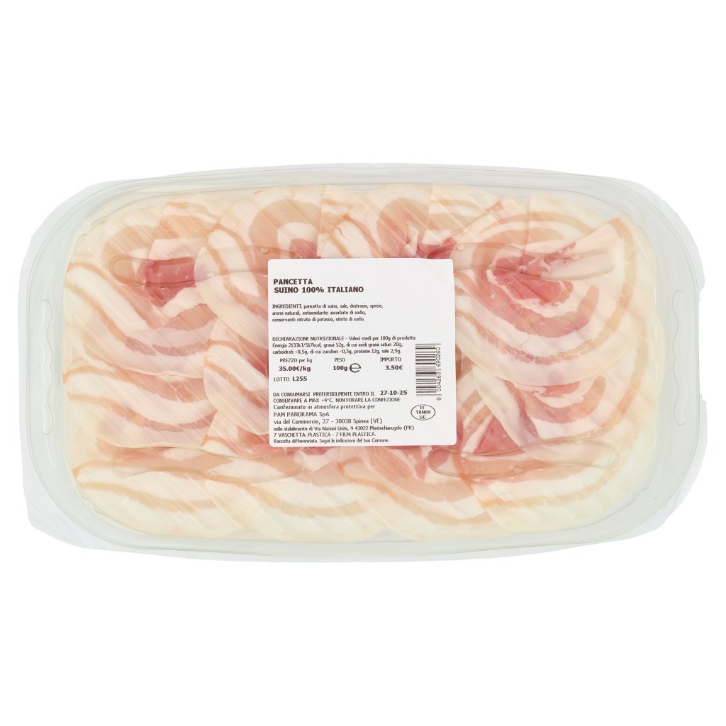 Pancetta di suino, Sale, Destrosio, Spezie, Aromi naturali, Antiossidante: ascorbato di sodio, Conservanti: nitrato di potassio, nitrito di sodio