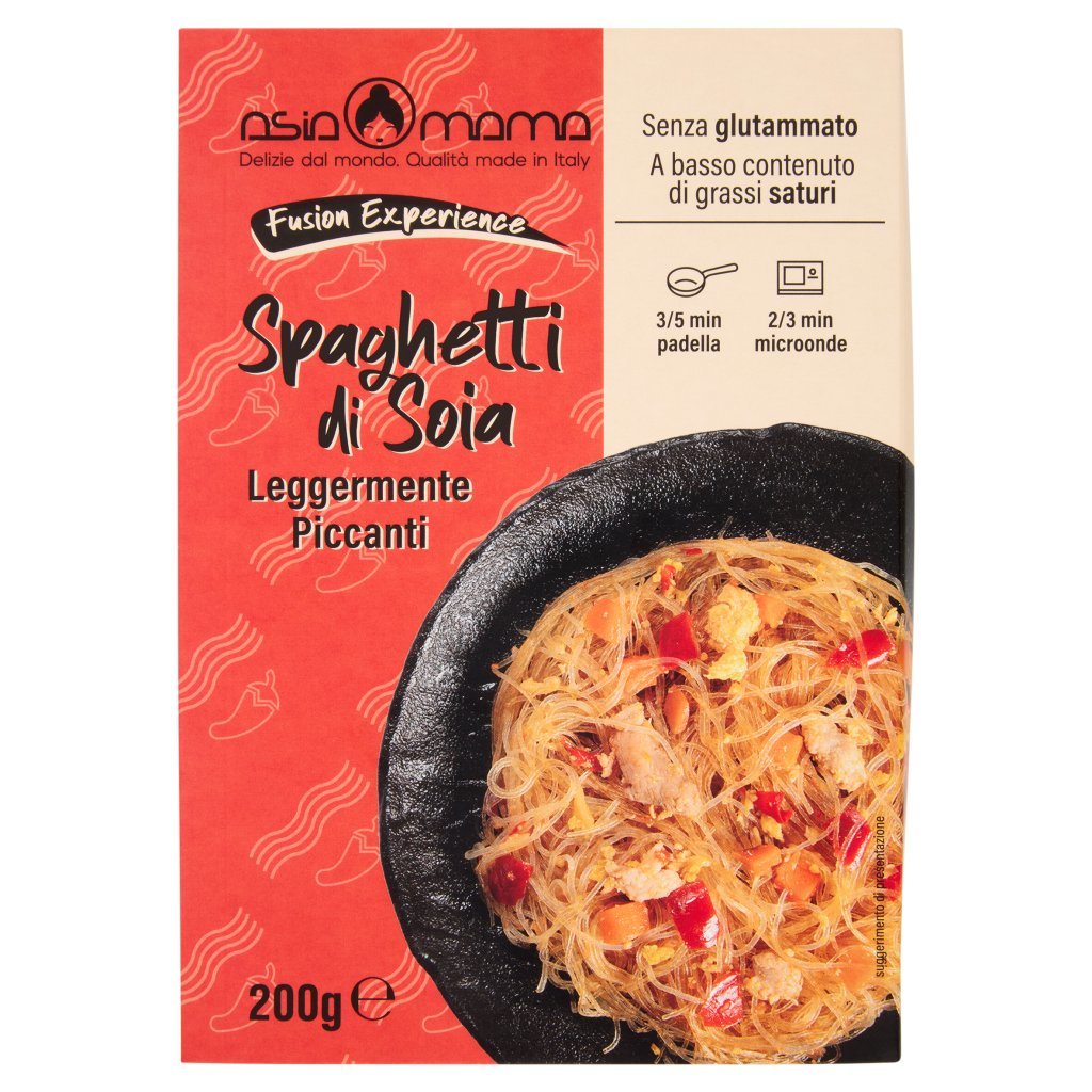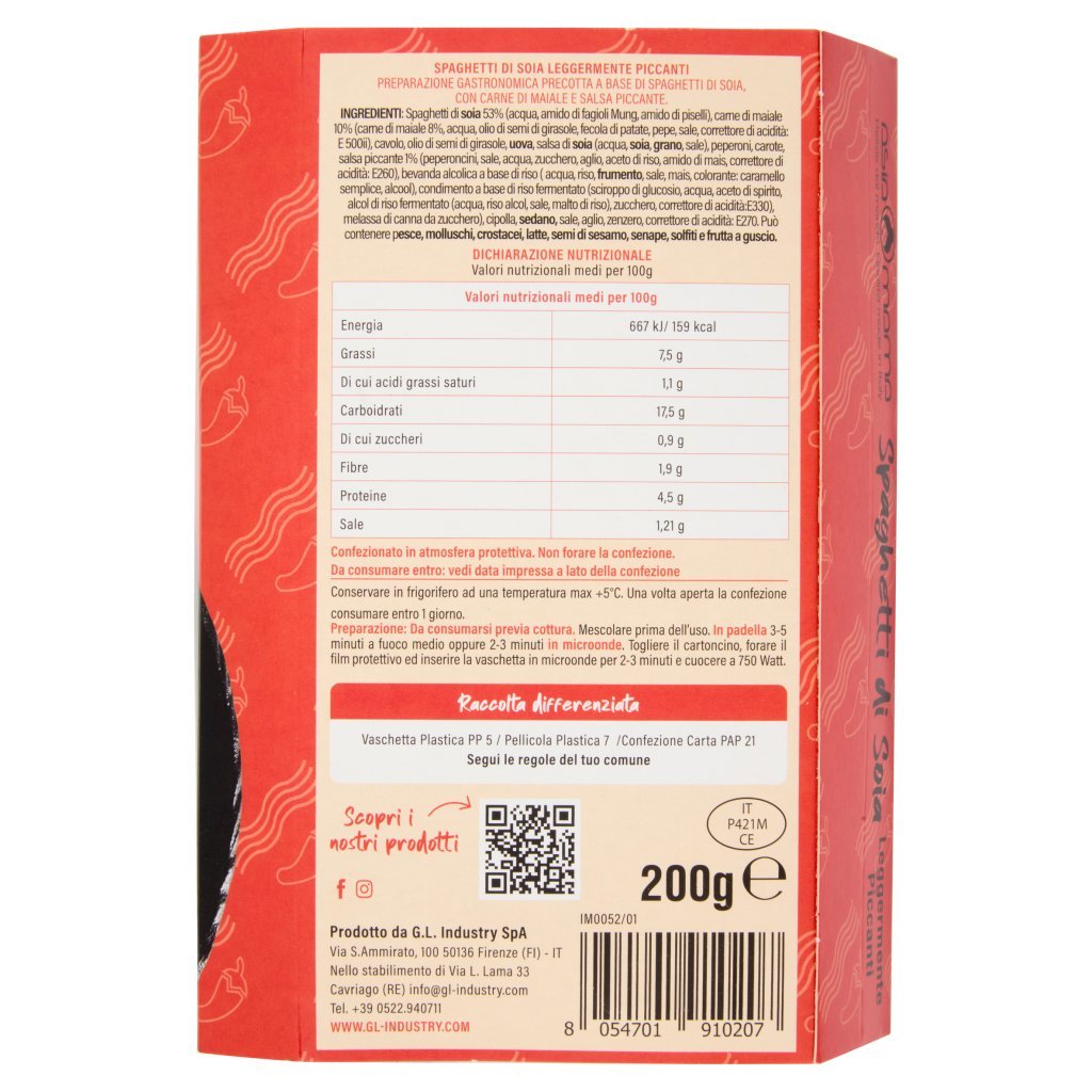 Spaghetti di soia 53% (acqua, amido di fagioli Mung, amido di piselli), Carne di maiale 10% (carne di maiale 8%, acqua, olio di semi di girasole, fecola di patate, pepe, sale, correttore di acidità: E 500ii), Cavolo, Olio di semi di girasole, Uova, Salsa di soia (acqua, soia, grano, sale), Peperoni, Carote, Salsa piccante 1% (peperoncini, sale, acqua, zucchero, aglio, aceto di riso, amido di mais, correttore di acidità: E260), Bevanda alcolica a base di riso (acqua, riso, frumento, sale, mais, colorante: caramello semplice, alcool), Condimento a base di riso fermentato (sciroppo di glucosio, acqua, aceto di spirito, alcol di riso fermentato (acqua, riso alcol, sale, malto di riso), zucchero, correttore di acidità:E330), melassa di canna da zucchero), Cipolla, Sedano, Sale, Aglio, Zenzero, Correttore di acidità: E270, Può contenere pesce, molluschi, crostacei, latte, semi di sesamo, senape, solfiti e frutta a guscio