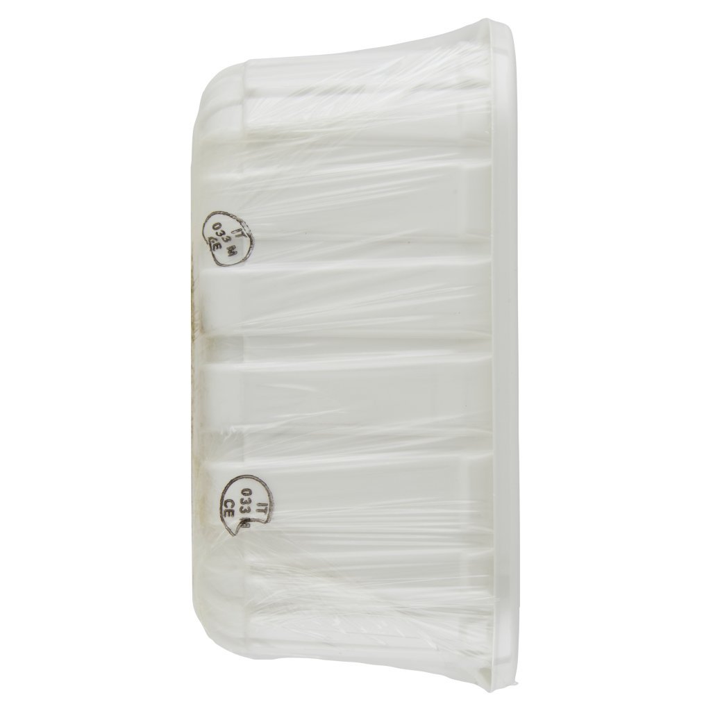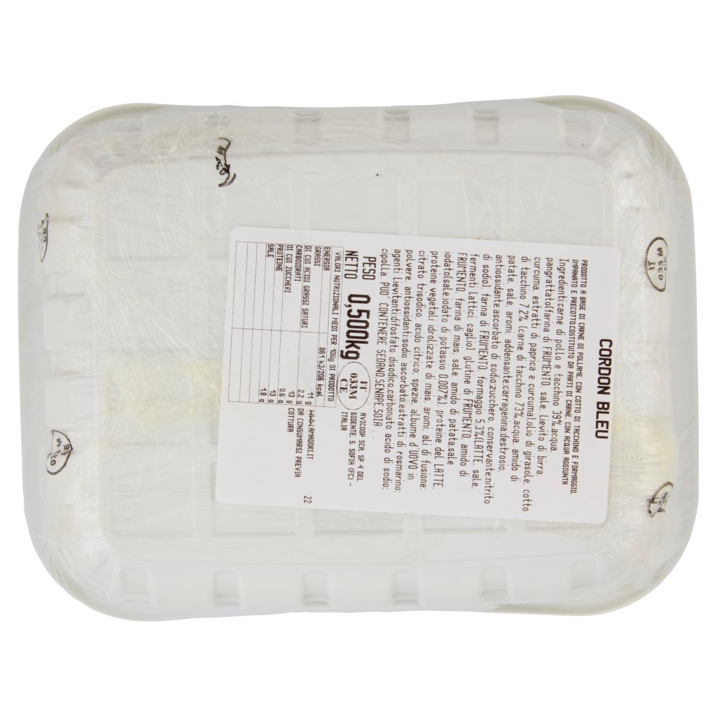 Carne di pollo e tacchino 39%, Acqua, Pangrattato(farina di frumento, sale, lievito di birra, curcuma, estratti di paprica e curcuma), Olio di girasole, Cotto di tacchino 7,2% (carne di tacchino 73%, acqua, amido di patate, sale, aromi, addensante:carragenina; destrosio, antiossidante:ascorbato di sodio;zucchero, conservante:nitrito di sodio), Farina di frumento, Formaggio 5,3%(latte, sale, fermenti lattici, caglio), Glutine di frumento, Amido di frumento, Farina di mais, Sale, Amido di patata, Sale iodato(sale, iodato di potassio 0,007%), Proteine del latte, Proteine vegetali idrolizzate di mais, Aromi, Ali di fusione: citrato trisodico, acido citrico, Spezie, Albume d'uovo in polvere, Antiossidanti:sodio ascorbato, estratti di rosmarino, Agenti lievitanti:difosfato disodico, carbonato acido di sodio, Cipolla, Può contenere sedano, senape, soia