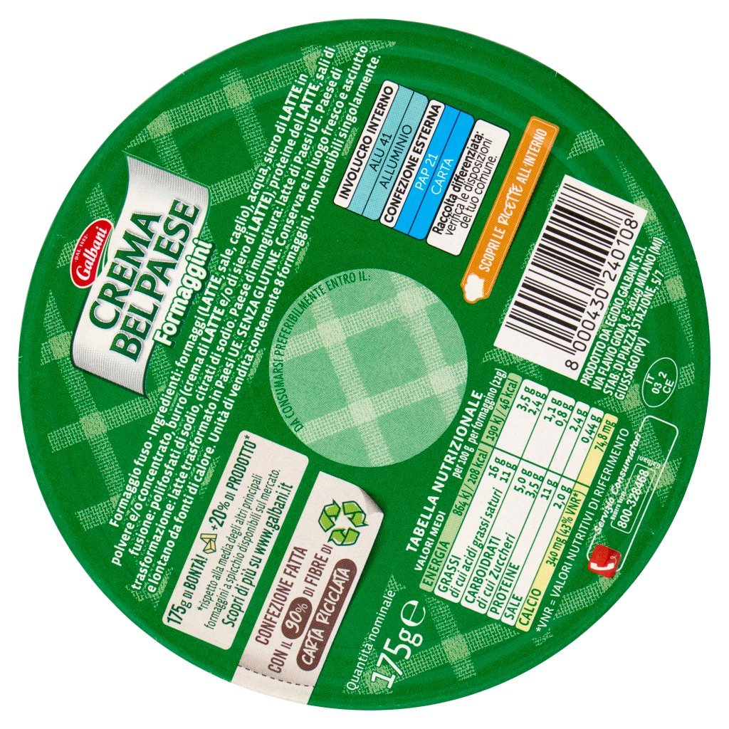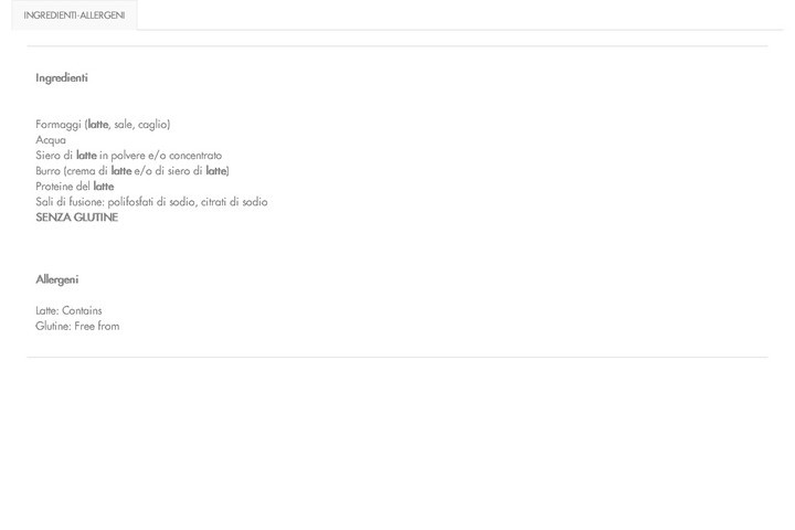 Formaggi (latte, sale, caglio), Acqua, Siero di latte in polvere e/o concentrato, Burro (crema di latte e/o di siero di latte), Proteine del latte, Sali di fusione: polifosfati di sodio, citrati di sodio, Senza glutine