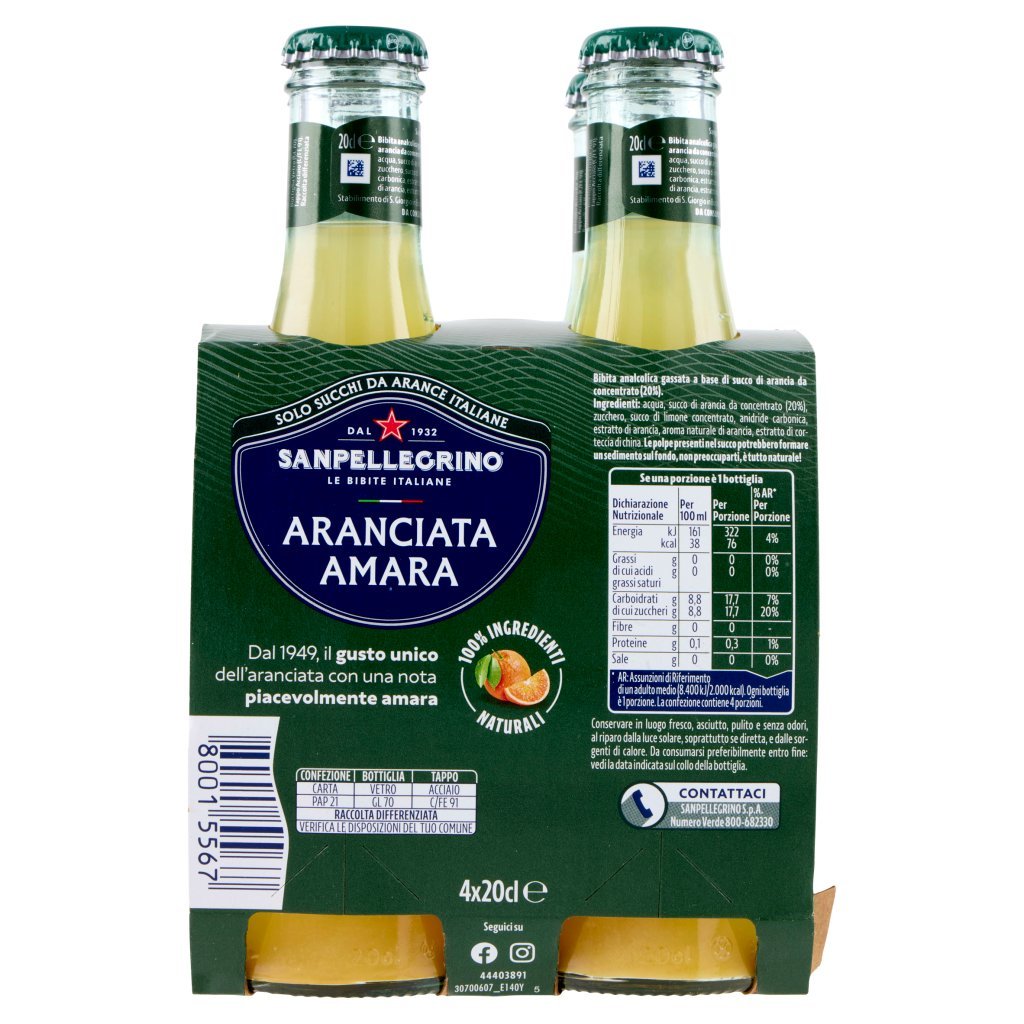 Acqua, Succo di arancia da concentrato (20%), Zucchero, Succo di limone concentrato, Anidride carbonica, Estratto di arancia, Aroma naturale di arancia, Estratto di corteccia di china