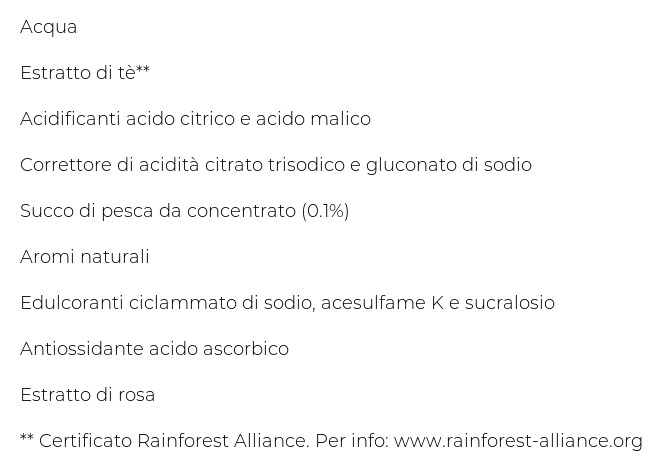 Acqua, Estratto di tè**, Acidificanti acido citrico e acido malico, Correttore di acidità citrato trisodico e gluconato di sodio, Succo di pesca da concentrato (0.1%), Aromi naturali, Edulcoranti ciclammato di sodio, acesulfame K e sucralosio, Antiossidante acido ascorbico, Estratto di rosa, ** Certificato Rainforest Alliance. Per info: www.rainforest-alliance.org