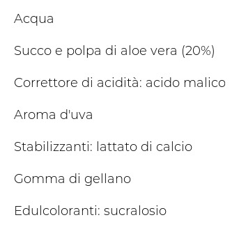 Acqua, Succo e polpa di aloe vera (20%), Correttore di acidità: acido malico, Aroma d'uva, Stabilizzanti: lattato di calcio, Gomma di gellano, Edulcoloranti: sucralosio