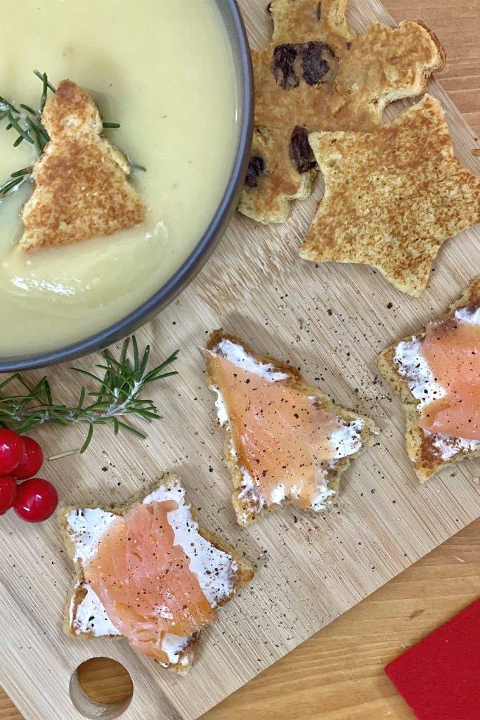 Tagliamo il panettone o il pandoro a fette dello spessore di 1 cm in parti più piccole della forma preferita (volendo usando delle formine da biscotti) che faremo dorare in una padella antiaderente o su una piastra da entrambe le parti finché non diventeranno croccanti. Farciamo poi a piacere con del formaggio spalmabile e salmone oppure con un companatico salato che possa ben contrastare il gusto dolce del crostino. In alternativa, potete usarli come crostini da aggiungere alle zuppe.